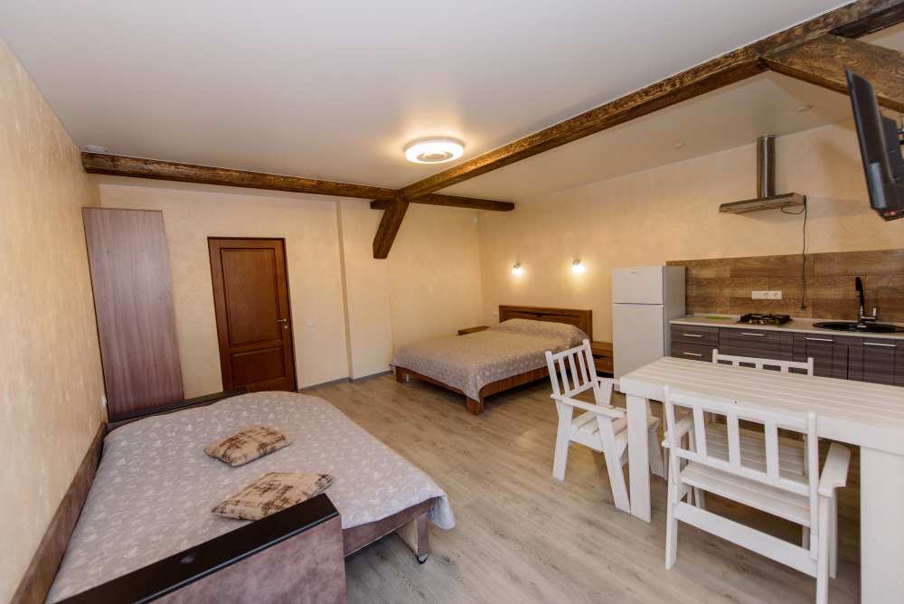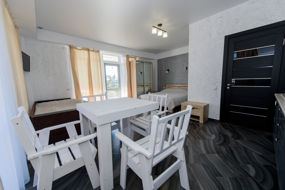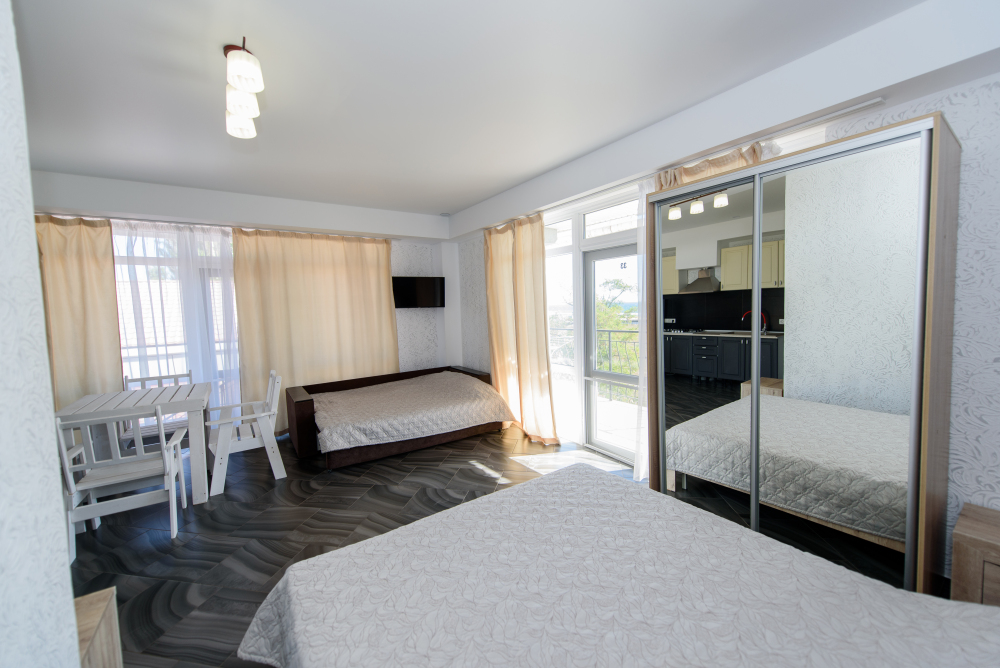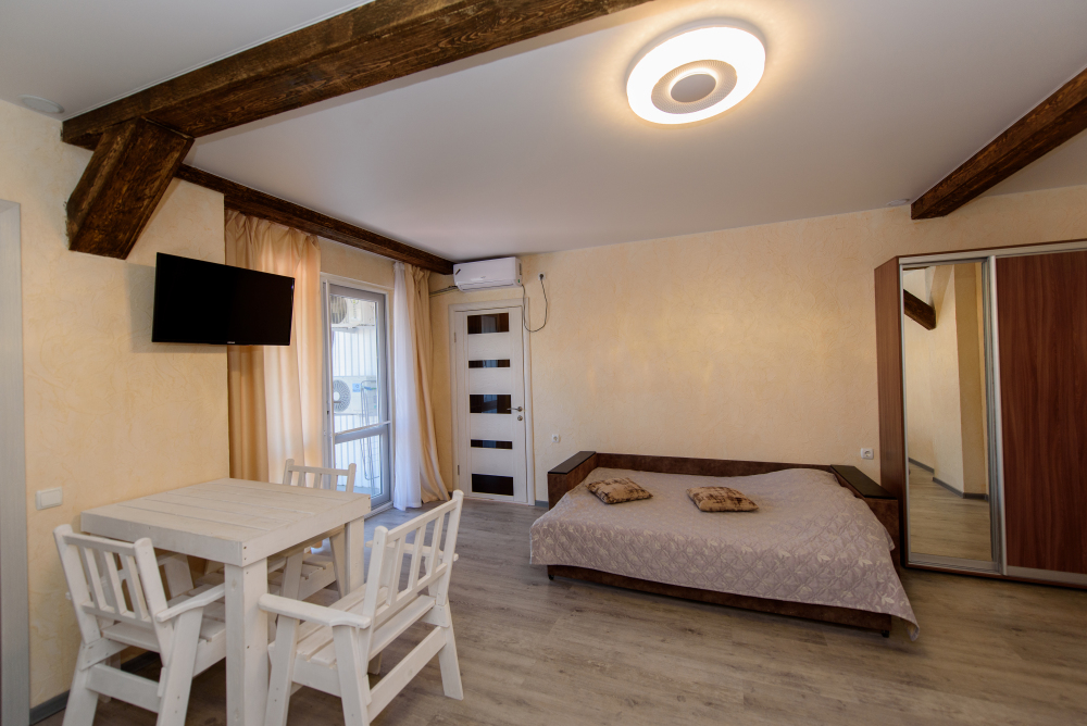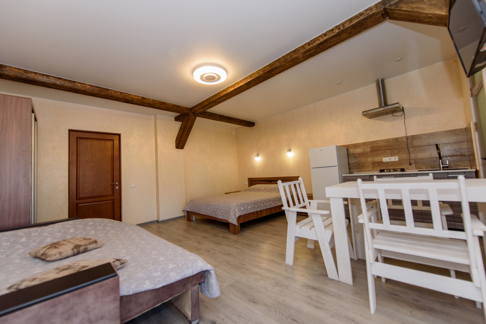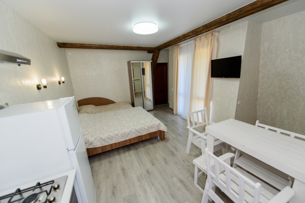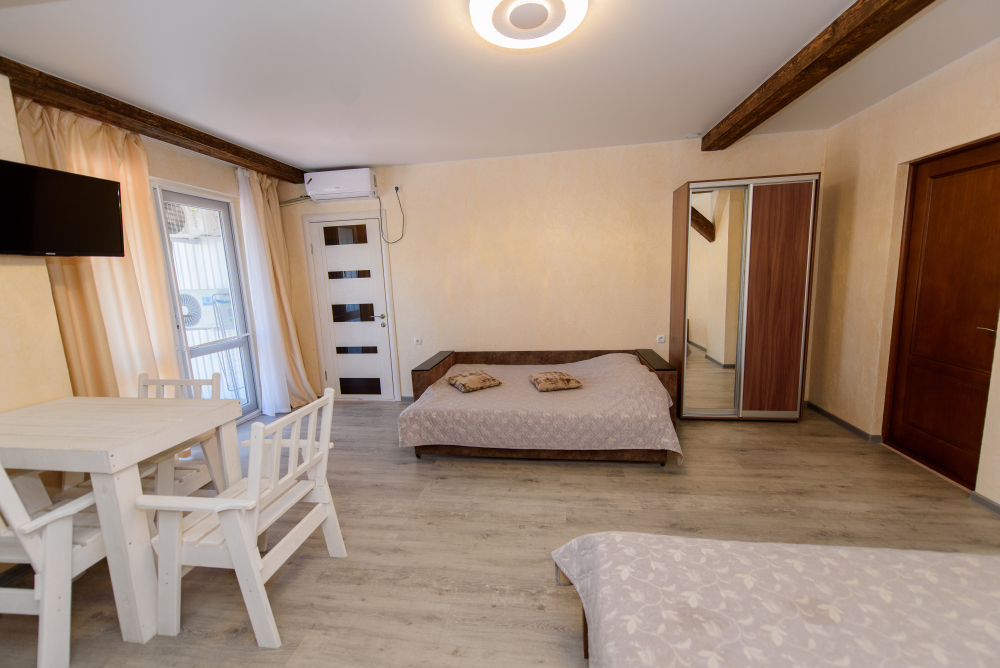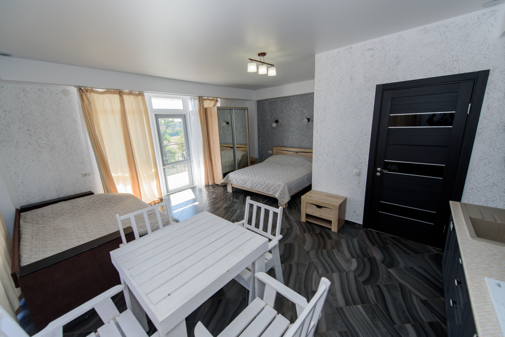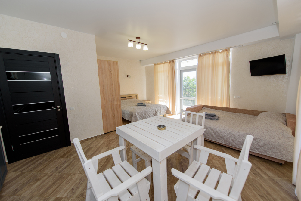 Каждый из номеров укомплектован тремя спальными местами (двуспальная кровать и дополнительное место – кресло-кровать) или двумя спальными местами: двуспальная кровать