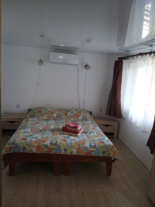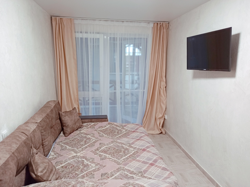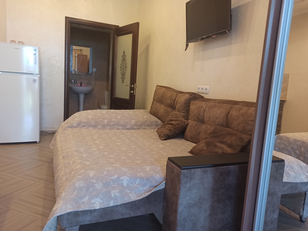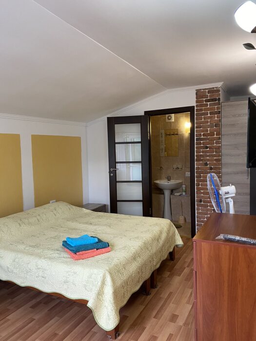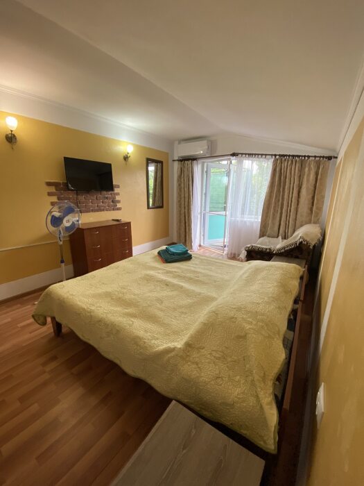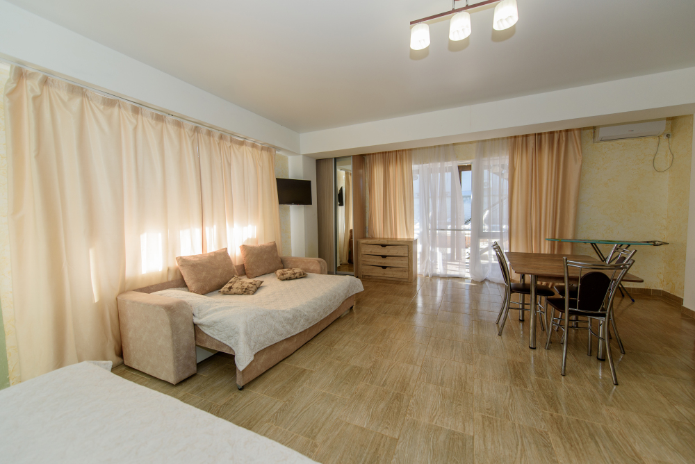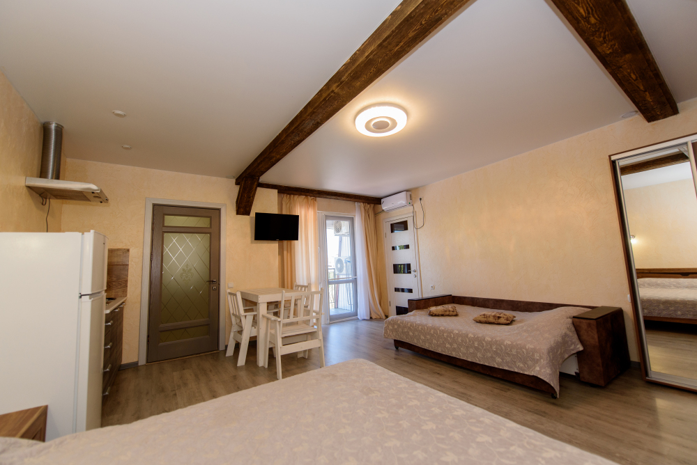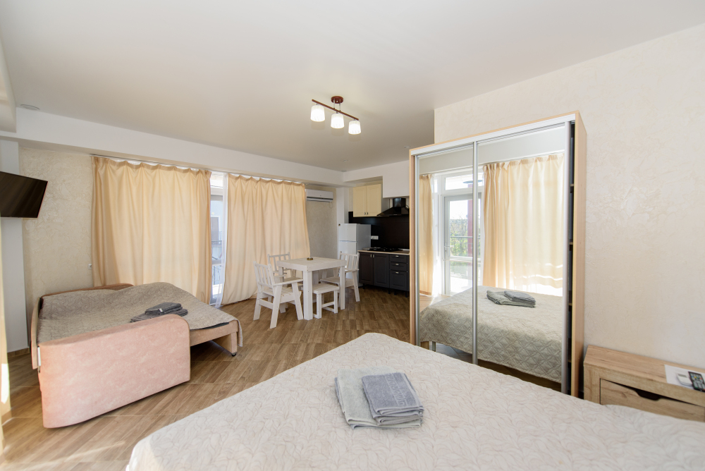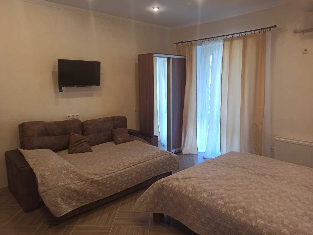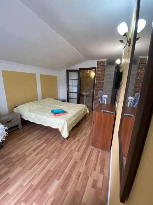 Каждый из номеров укомплектован тремя спальными местами (двуспальная кровать и дополнительное место – кресло-кровать) или двумя спальными местами: двуспальная кровать