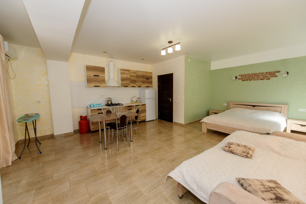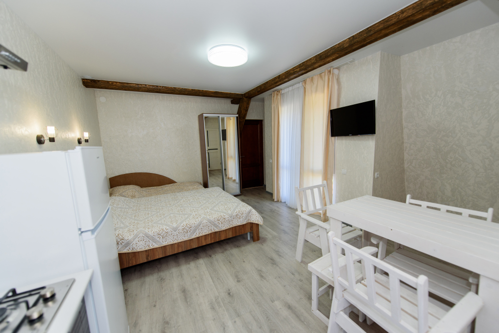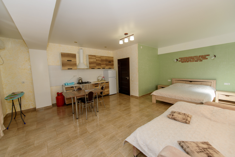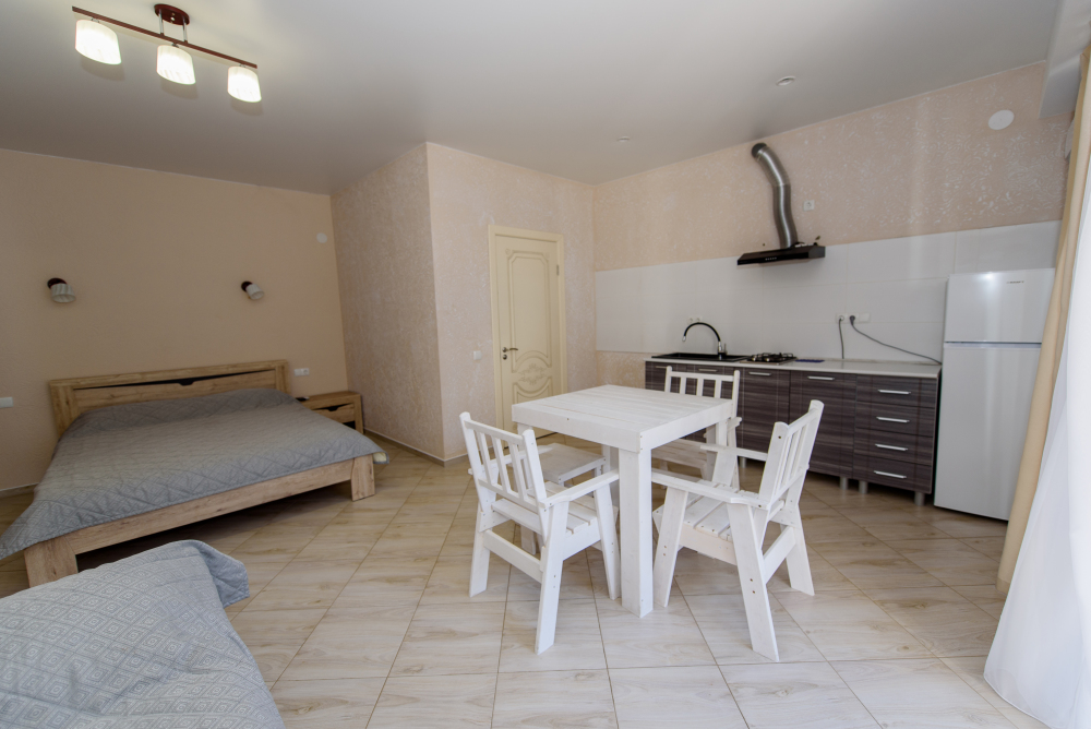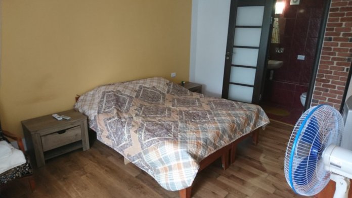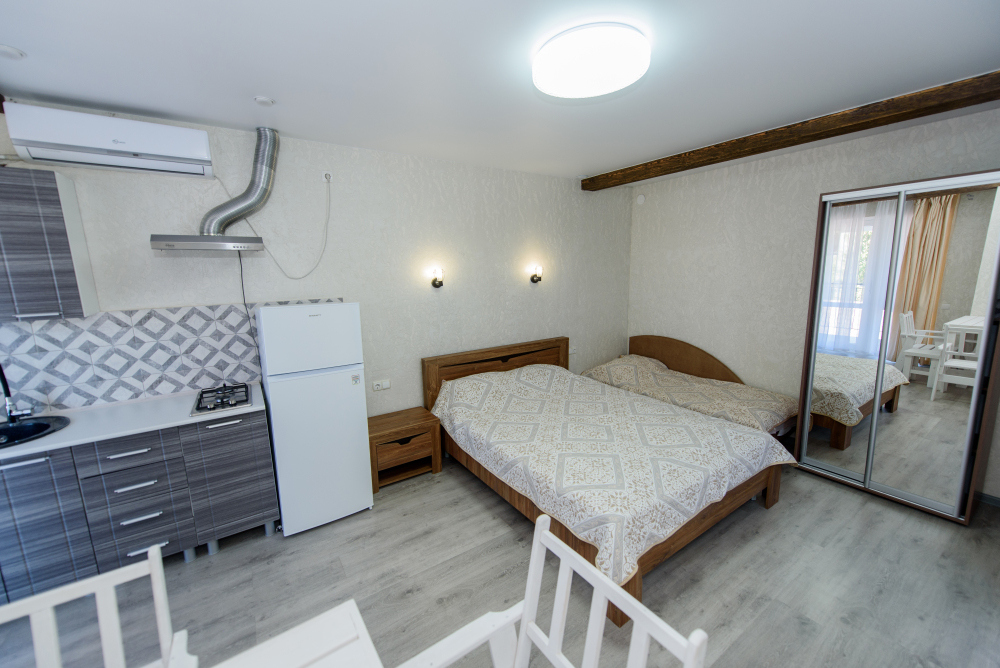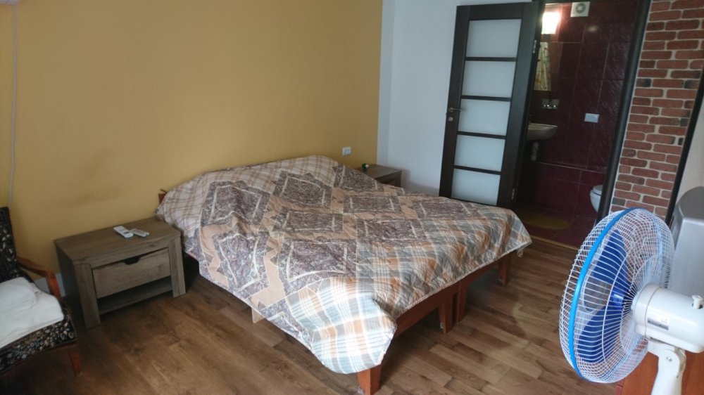 Номера выполнены в различных цветовых решениях.Есть все необходимое: телевизоры, Wi-fi, кондиионеры, вентиляторы. Две больших кухни укомплектованы холодильниками, газовыми плитами, посудой. На кухне у каждого отдельный стол с посудой.