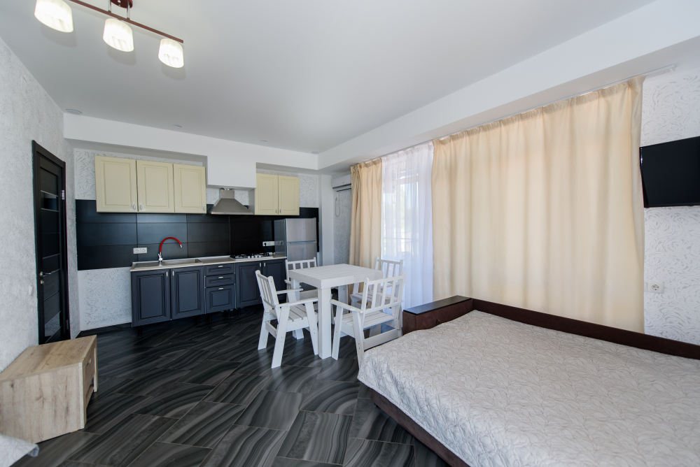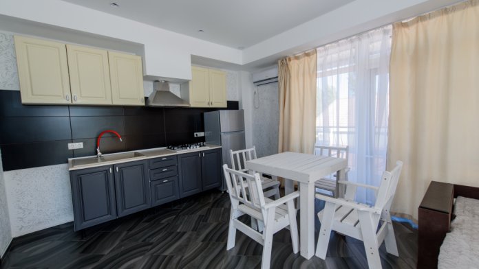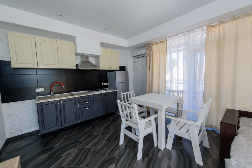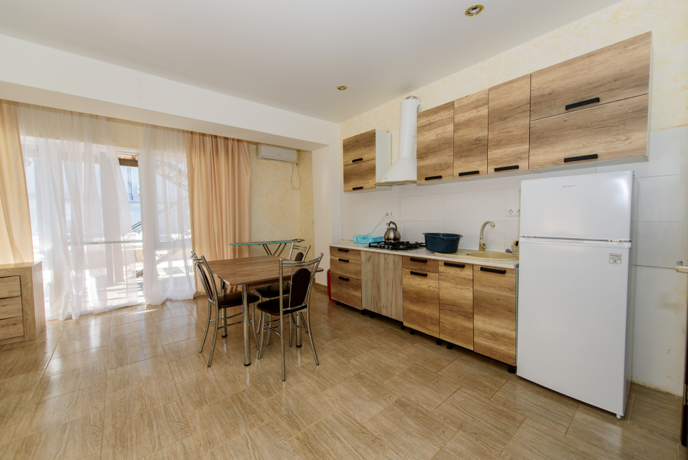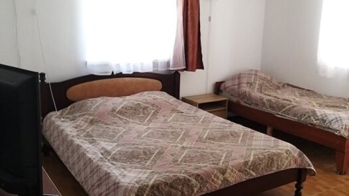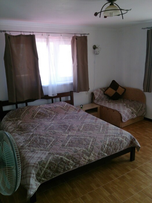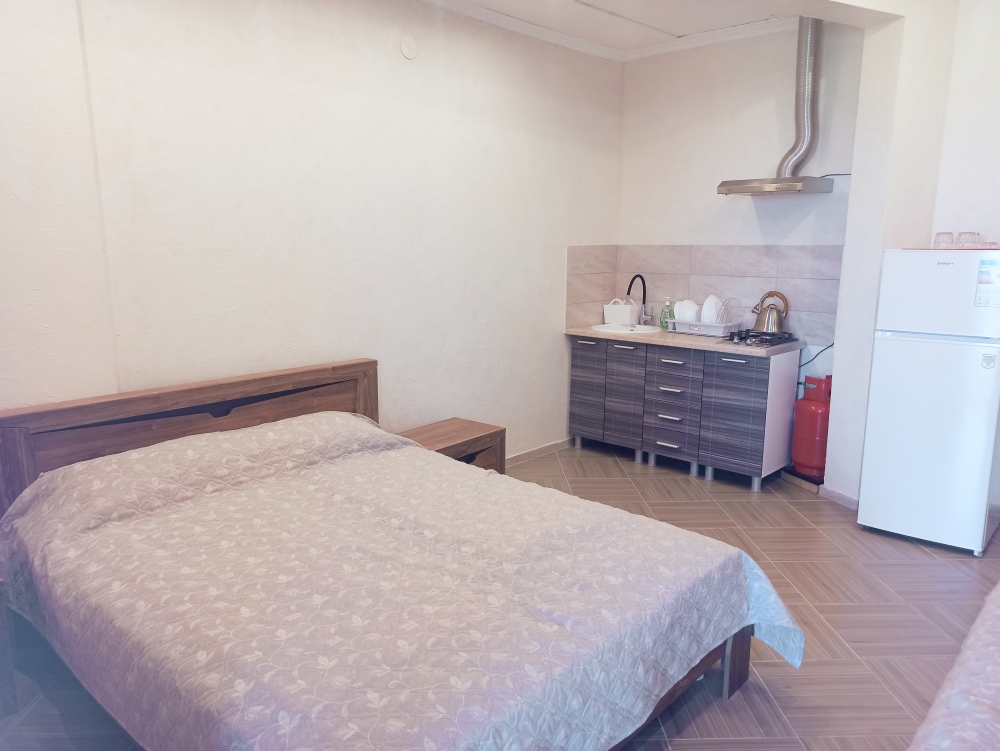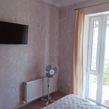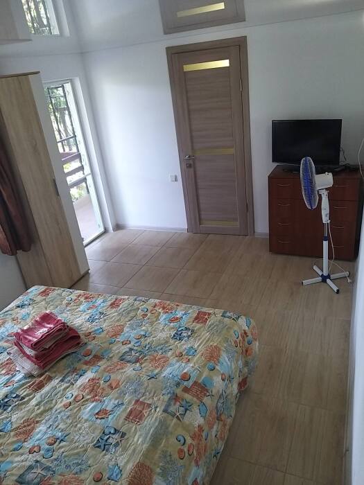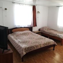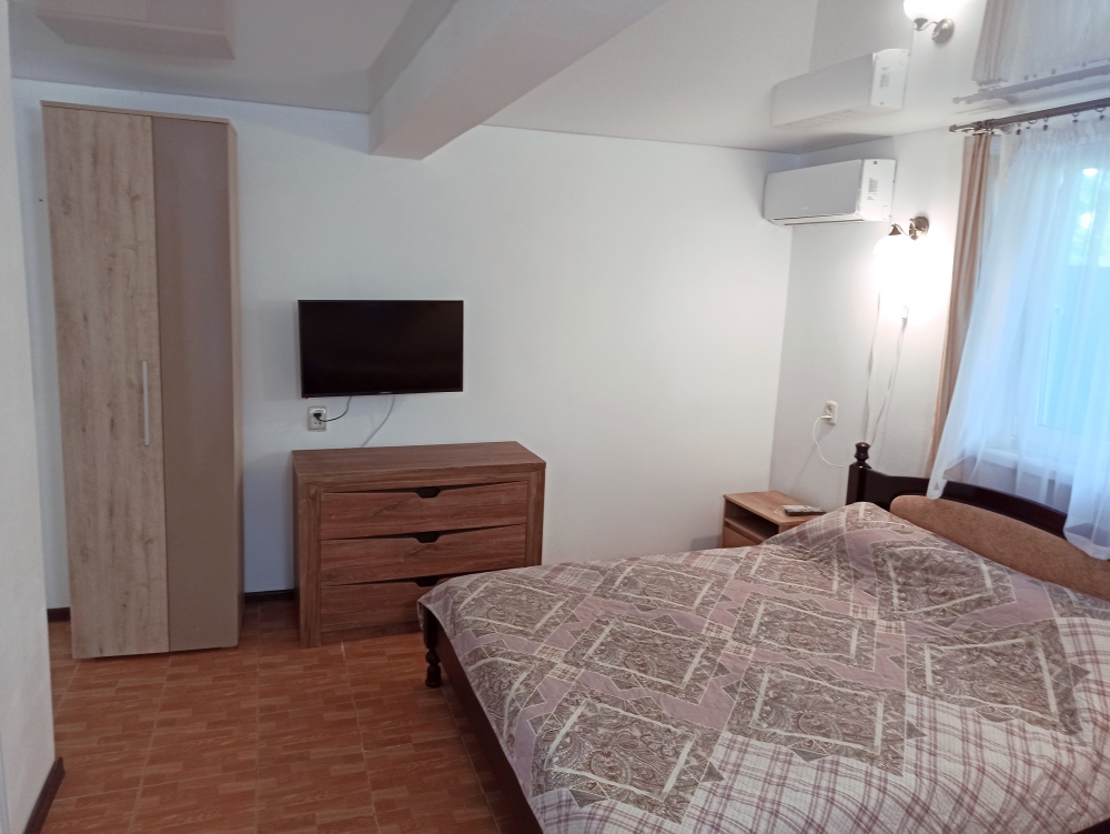 Номера выполнены в различных цветовых решениях.Есть все необходимое: телевизоры, Wi-fi, кондиионеры, вентиляторы. Две больших кухни укомплектованы холодильниками, газовыми плитами, посудой. На кухне у каждого отдельный стол с посудой.