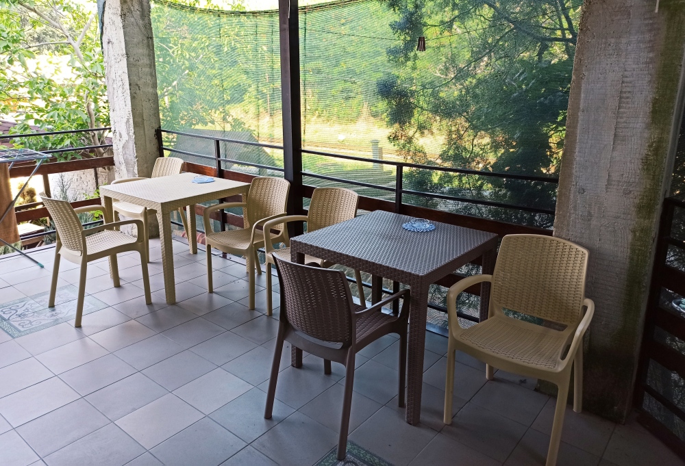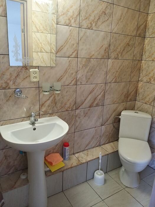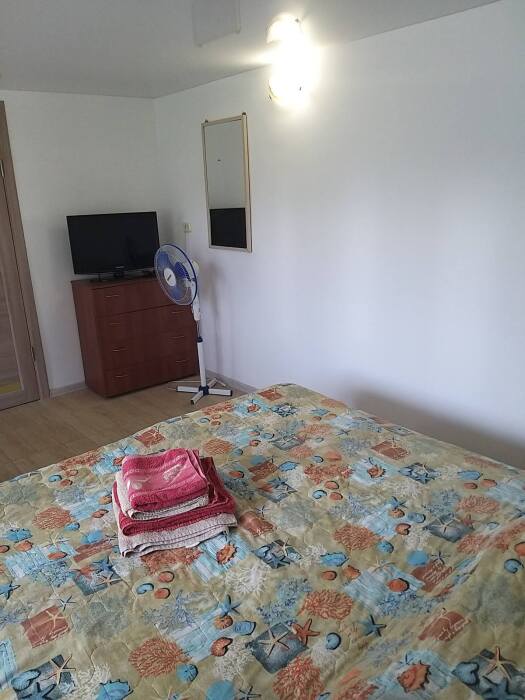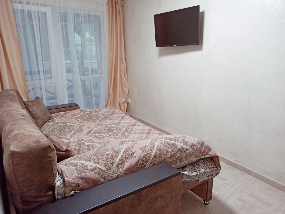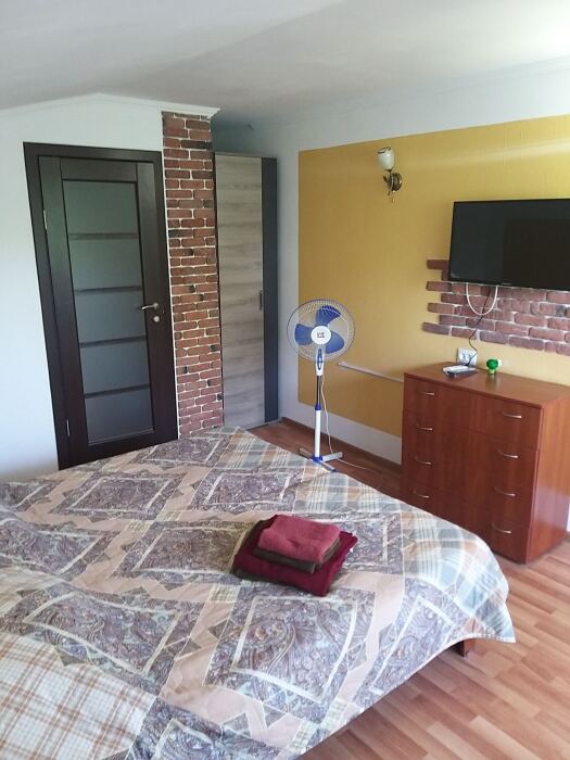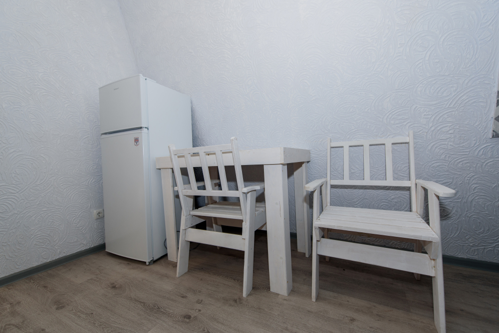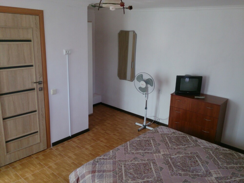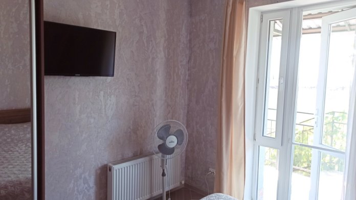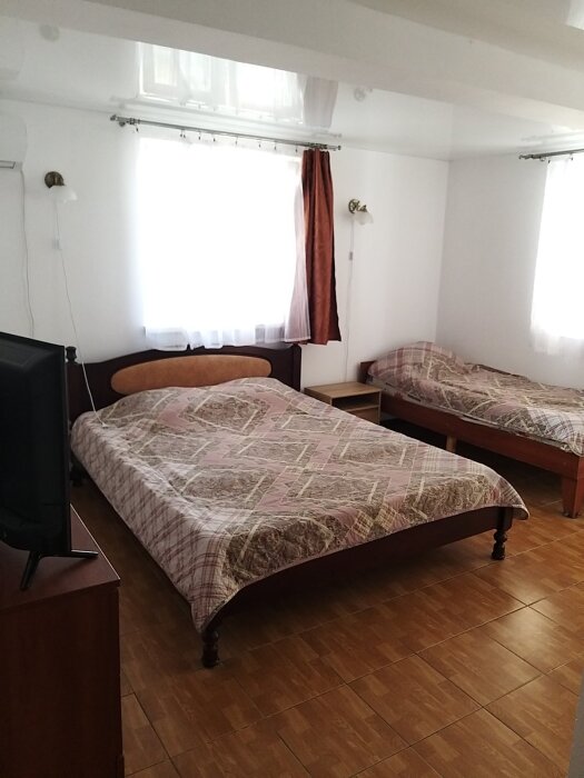 Номера выполнены в различных цветовых решениях.Есть все необходимое: телевизоры, Wi-fi, кондиионеры, вентиляторы. Две больших кухни укомплектованы холодильниками, газовыми плитами, посудой. На кухне у каждого отдельный стол с посудой.