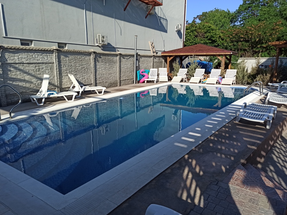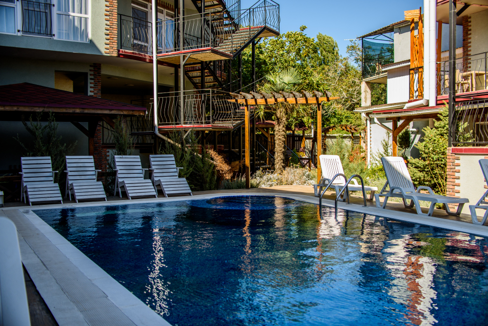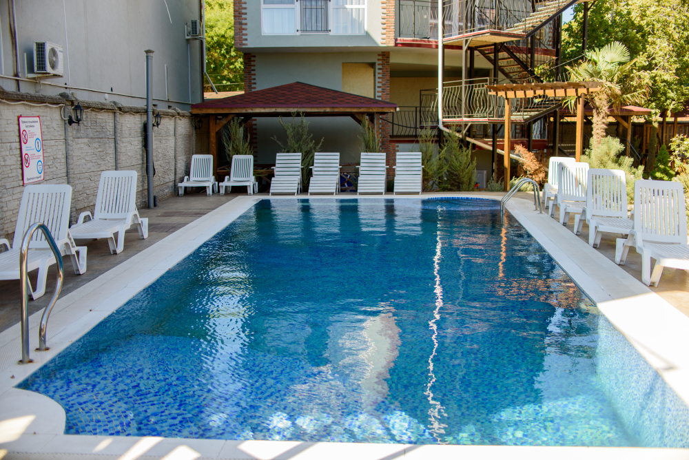На территории есть детская площадка, большие беседки, мангалы. Также есть огромный бассейн, выходящий в стоимость номеров стандарт и за доп.плату для эконом номеров.