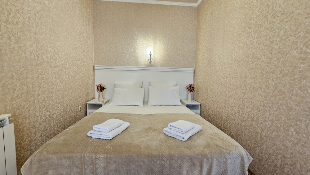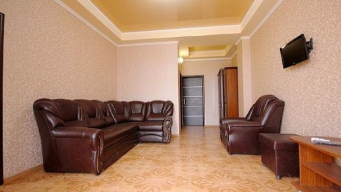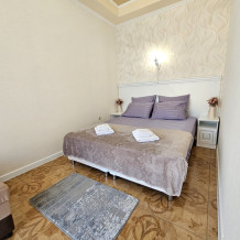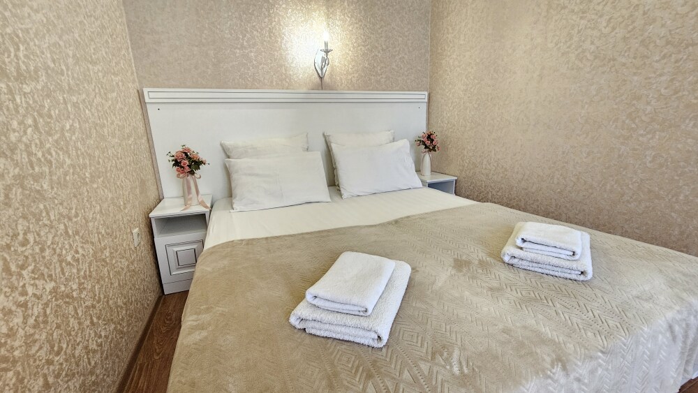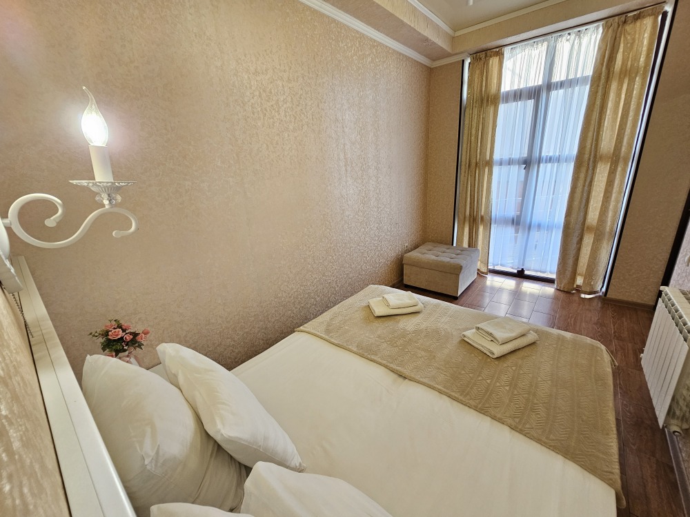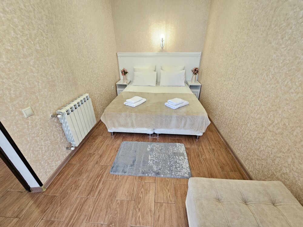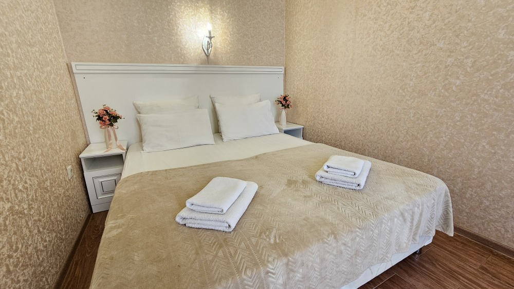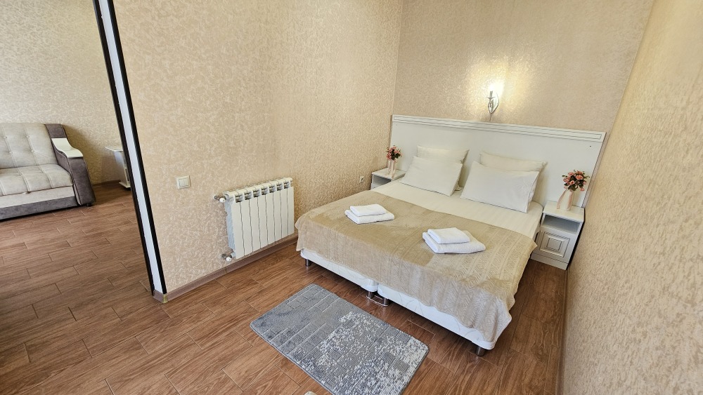В номере: гостиная с диванной зоной, комод с зеркалом и рабочим местом, стол журнальный, шкаф плательный, ТВ, холодильник,сплит-система. Спальня, с двуспальной кроватью. Санузел с душем. Балкон.