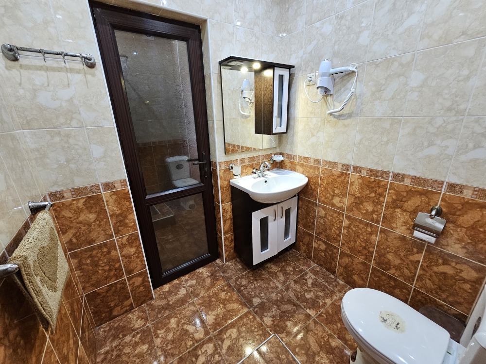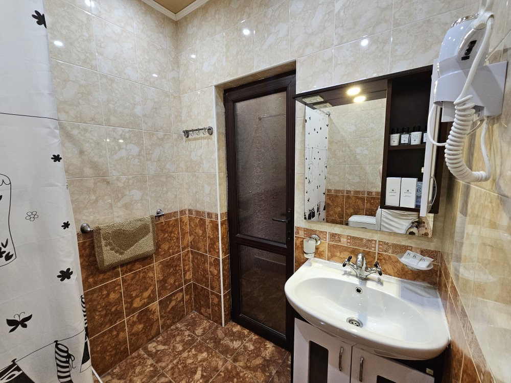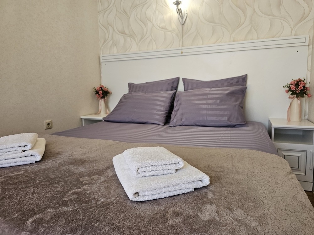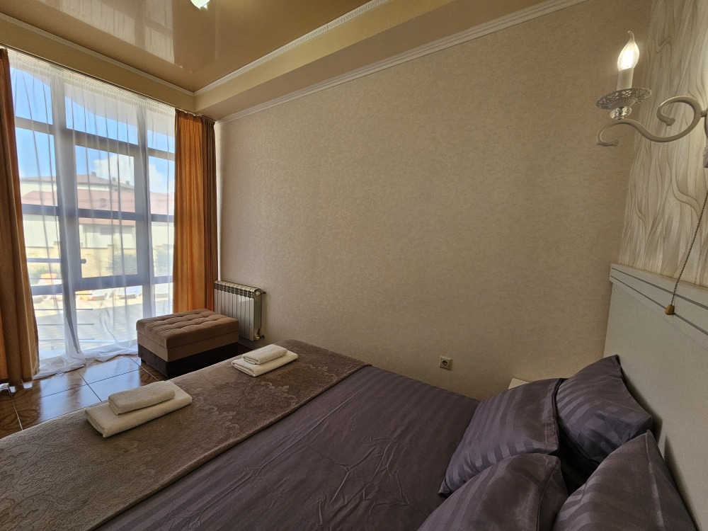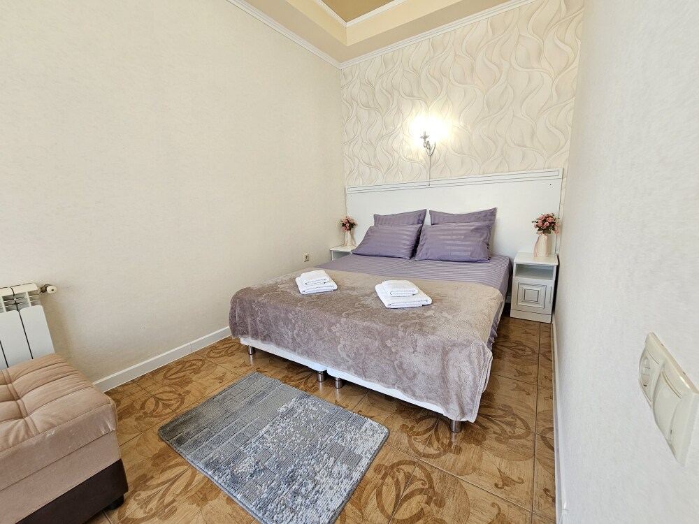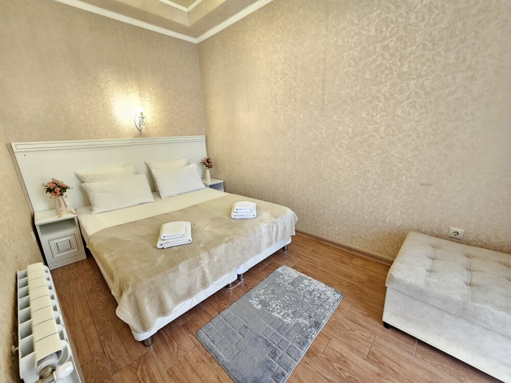 В номере: гостиная с диванной зоной, комод с зеркалом и рабочим местом, стол журнальный, шкаф плательный, ТВ, холодильник,сплит-система. Спальня, с двуспальной кроватью. Санузел с душем. Балкон.