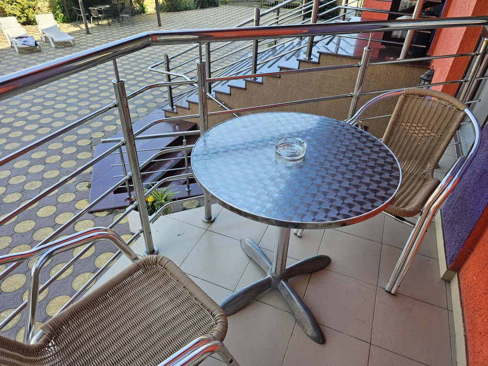 Отель представляет собой 4-этажное здание. Территория огороженная, с бассейном (с подогревом и гидромассажем) и большой уютной зоной отдыха, где Вы сможете проводить спокойные вечера в компании близких людей. Для детей предусмотрена детская площадка с домиком, горкой, лестницей, качелькой, каретой и батутом. В бассейне также имеется детское отделение, где могут резвиться маленькие гости. Около бассейна находится бар с освежающими напитками и легкими закусками. После купания можно отдохнуть в тени раскрытых зонтиков на стильных, удобных шезлонгах.