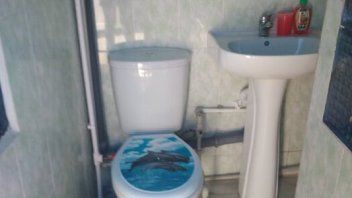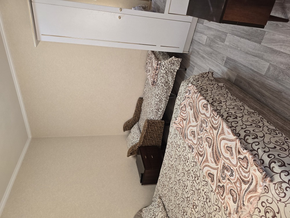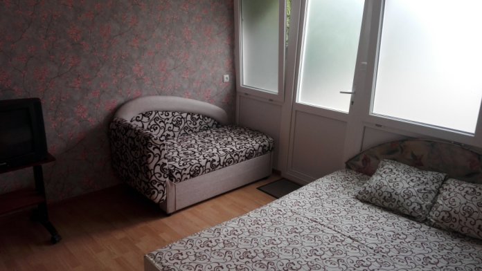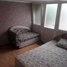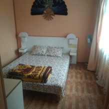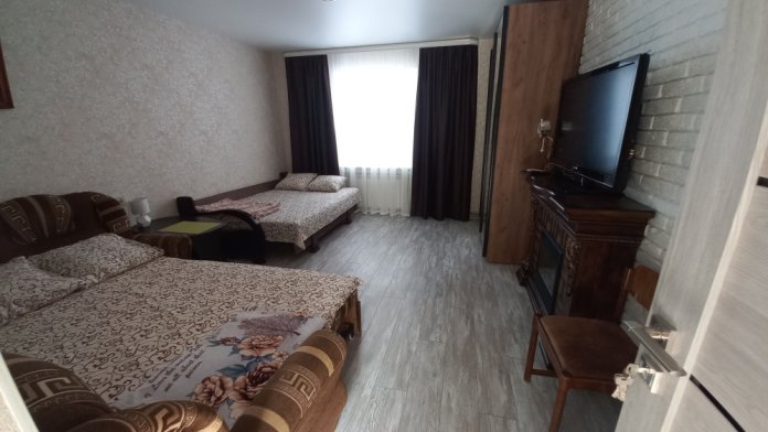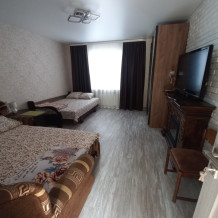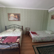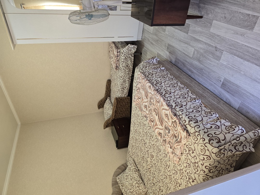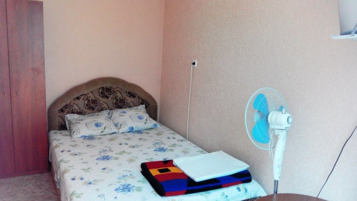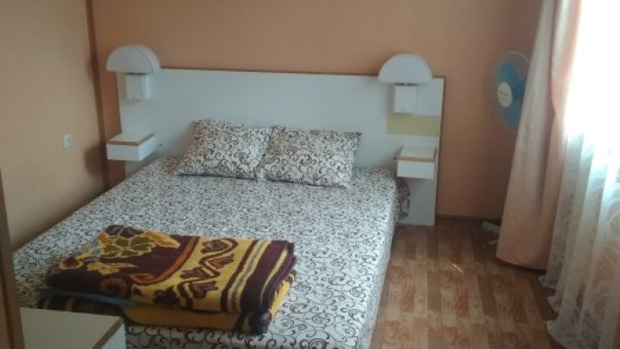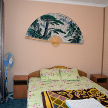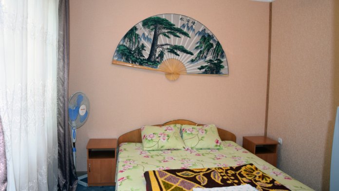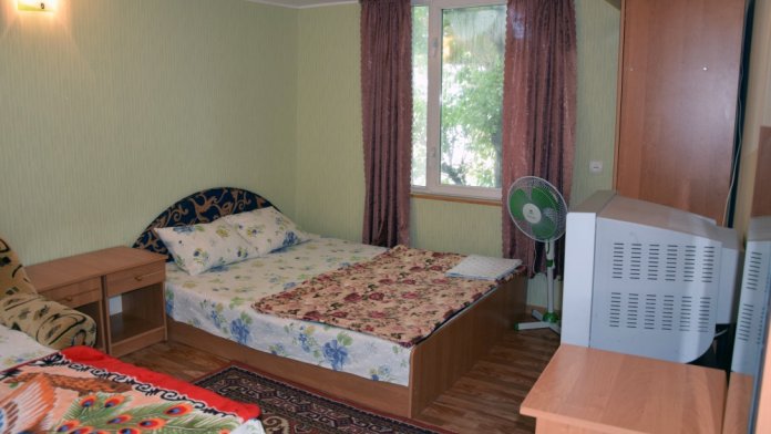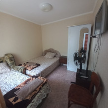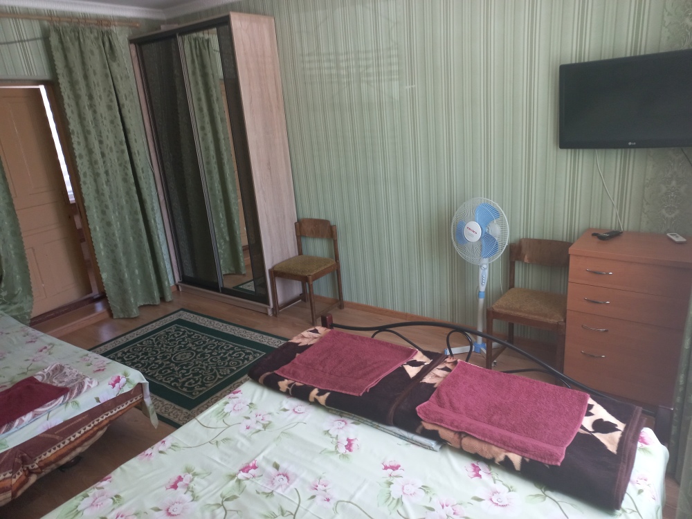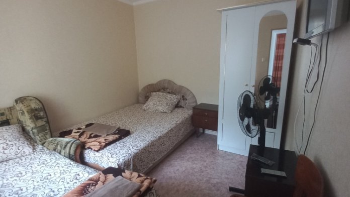 В комнате имеется диван-кровать и кресло-кровать, шкаф, прикроватные тумбочки, телевизор, вентилятор. Комната под ключ. Санузел на две комнаты. Кухня большая общая.