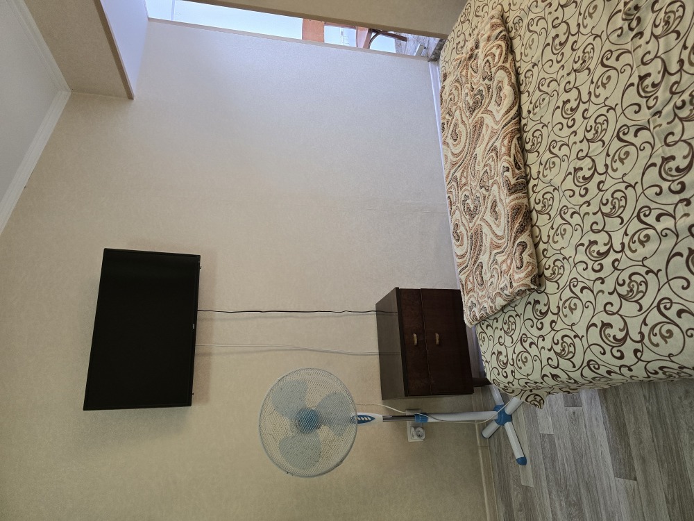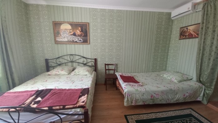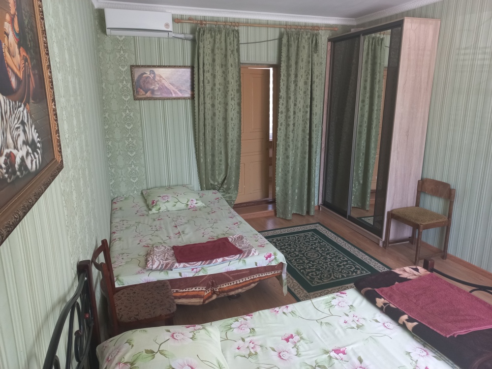 В комнате 3 спальных места: две кровати, диван; комод, шкаф, телевизор, вентилятор, кондиционер. Комната под ключ. Санузел на две комнаты. Кухня большая общая.