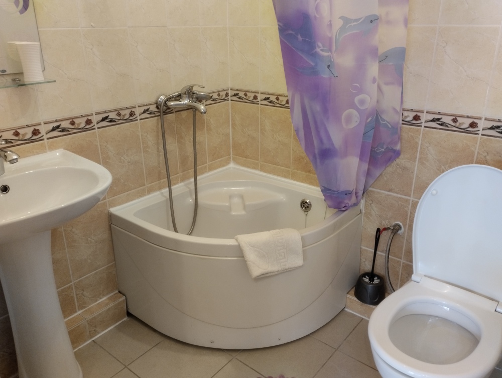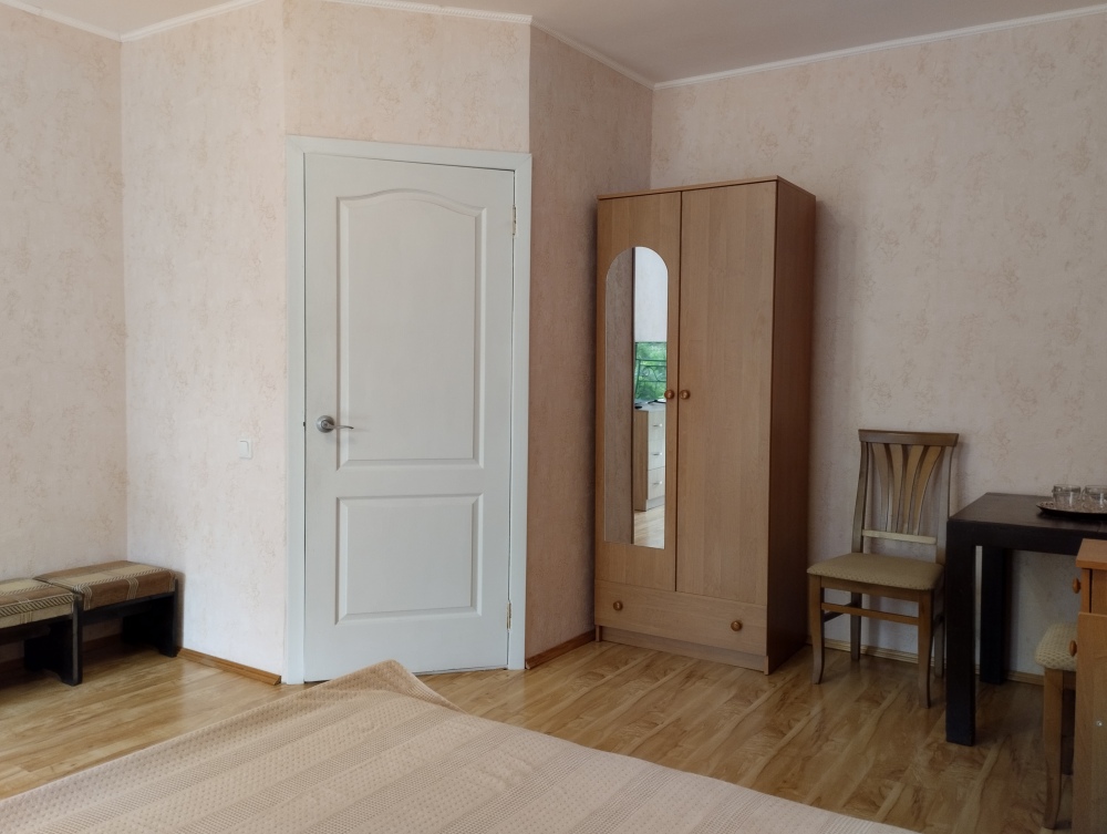 четырехместный номер расположен на первом этаже. В номере свой санузел с душевой кабиной, две двуспальные кровати, шкаф с зеркалом. Номер выходит во внутренний дворик, весь в зелени. Кипарисы, сосны, кедр, розы, розмарин насыщают воздух непередаваемым ароматом.