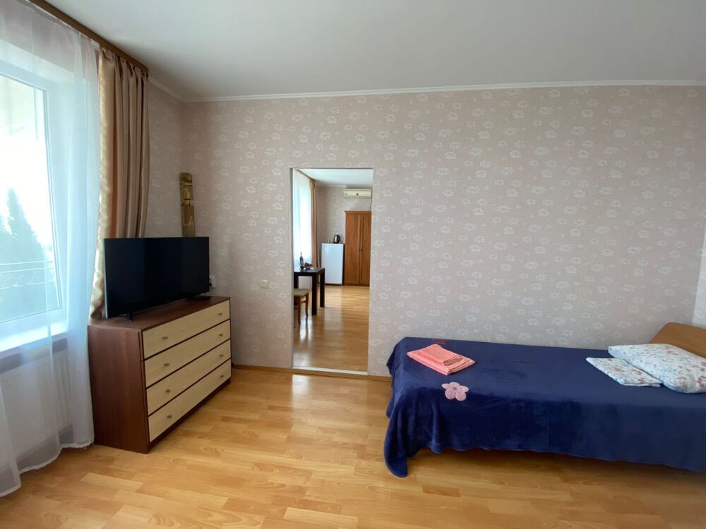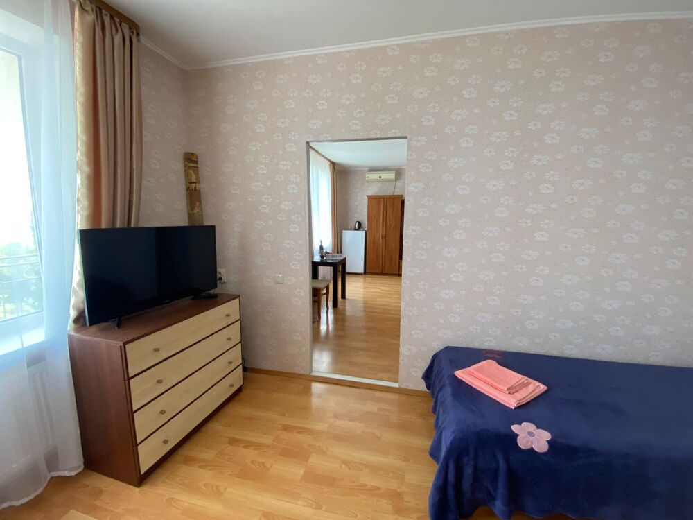Просторный двухкомнатный номер расположен на втором этаже, имеет большой балкон с великолепным видом на море и гору Аю-Даг. В номере площадью 40 кв.м две спальни и санузел, две полуторные кровати, мебельная стенка. Во второй спальне двуспальная кровать, две прикроватные тумбочки, комод и ЖК-телевизор, кондиционер и холодильник, электрический чайник. На просторном балконе предусмотрены столик и кресла, чтобы наслаждаться нереально красивым видом моря, гор и зеленых парков, вдыхая свежий, пьянящий воздух, пахнущий морем, соснами, можжевельником и цветами.