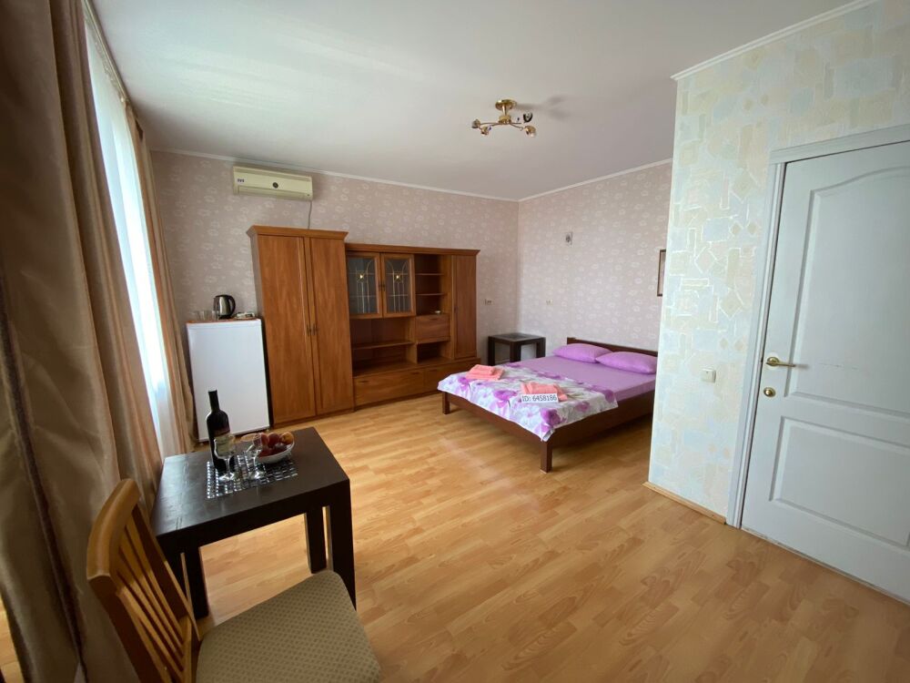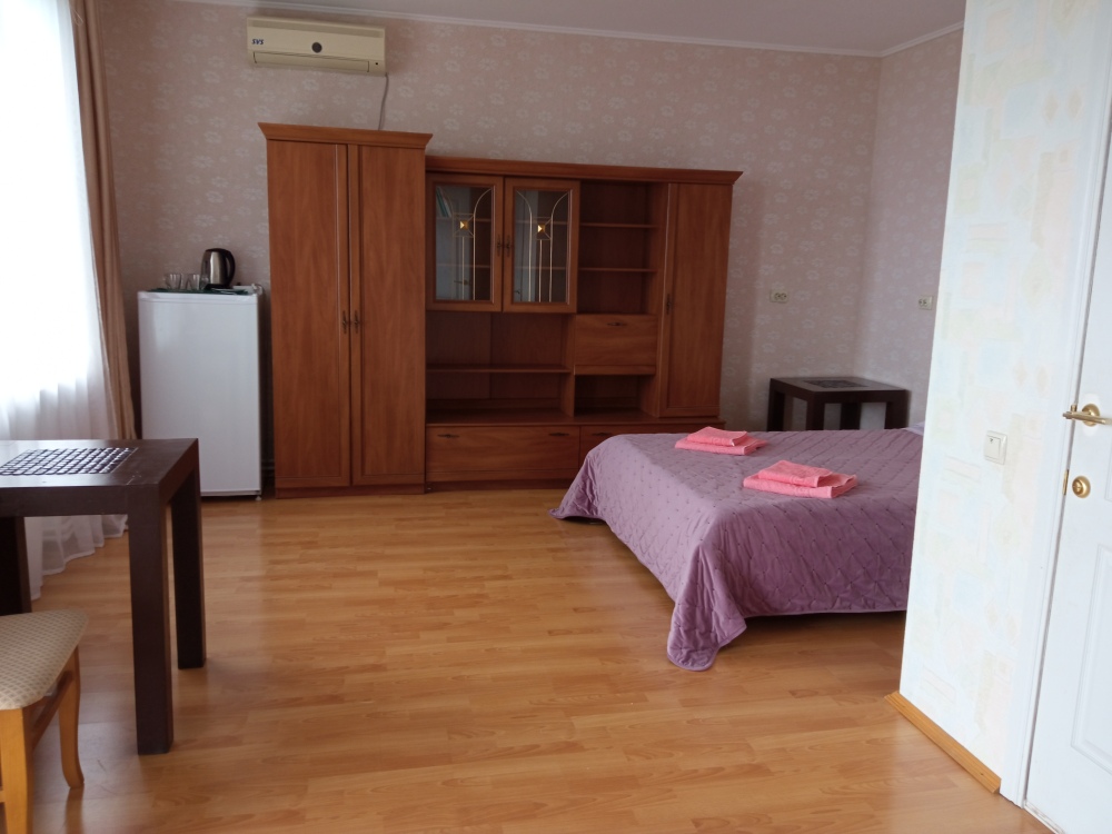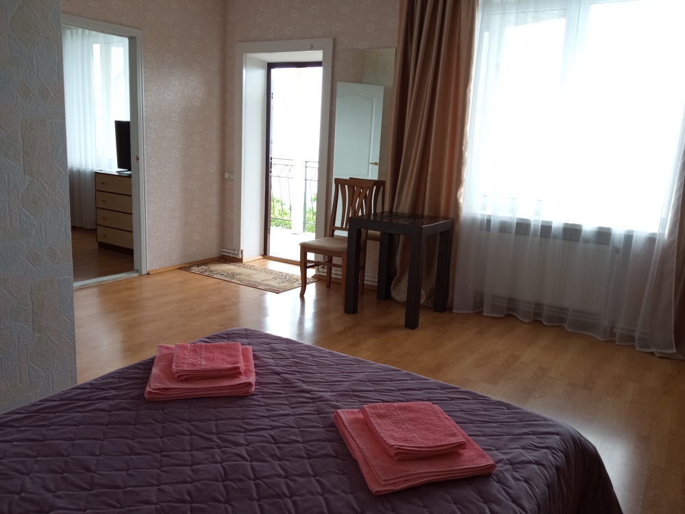 Просторный четырехместный номер расположен на втором этаже. В номере свой санузел с душевой кабиной, удобная двуспальная кровать, шкаф, туалетный столик с зеркалом, комод. В номере есть также полуторная кровать. при необходимости предоставляется дополнительное спальное место. Большой красивый балкон выходит во внутренний дворик, весь в зелени. Кипарисы, сосны, кедр, розы, розмарин насыщают воздух непередаваемым ароматом. С балкона также есть боковой вид на море!