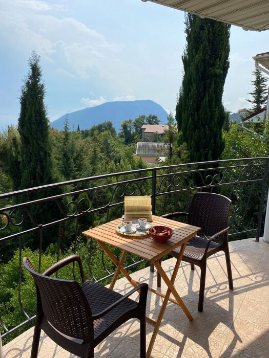 Просторный трехместный номер расположен на втором этаже. В номере свой санузел с душевой кабиной, удобная двуспальная кровать, шкаф, туалетный столик с зеркалом, комод. В номере есть также полуторная кровать. Большой красивый балкон выходит во внутренний дворик, весь в зелени. Кипарисы, сосны, кедр, розы, розмарин насыщают воздух непередаваемым ароматом. С балкона также есть боковой вид на море!
