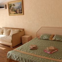 В номере: ЖК телевизором, кондиционер, утюг с гладильной доской, двуспальной кроватью с прикроватными тумбочками, столом, диван. Горячая и холодная вода круглосуточно.
