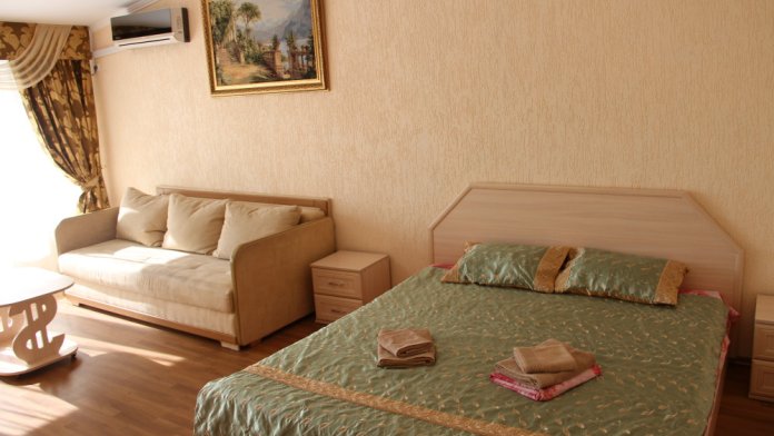 Для Вашего отдыха предлагаются комфортабельные 2-х, 4-х местные номера со всеми удобствами. Каждый номер оборудован: ЖК телевизором 32» (спутниковое или эфирное телевидение), кондиционером, холодильником, бойлером, эл. чайником, утюгом и гладильной доской, двуспальной кроватью с прикроватными тумбочками, столом, санузлом.