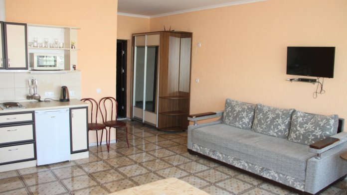 В номере плоский телевизор и кондиционер. Выход с номера на терраску с видом на море. На которой можно покушать. Номер находится на первом этаже. Терраса на два номера.