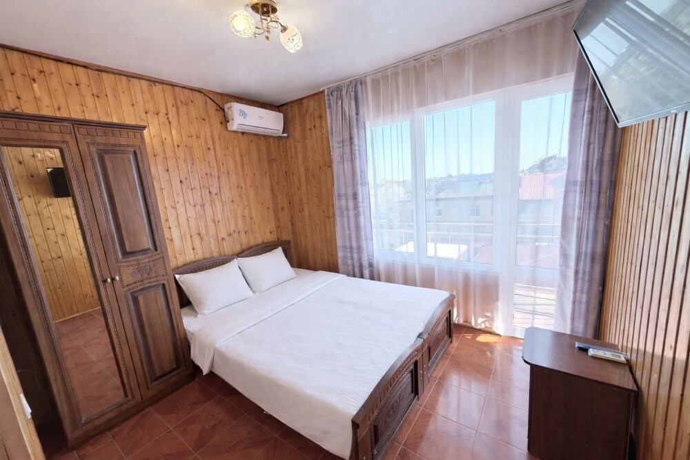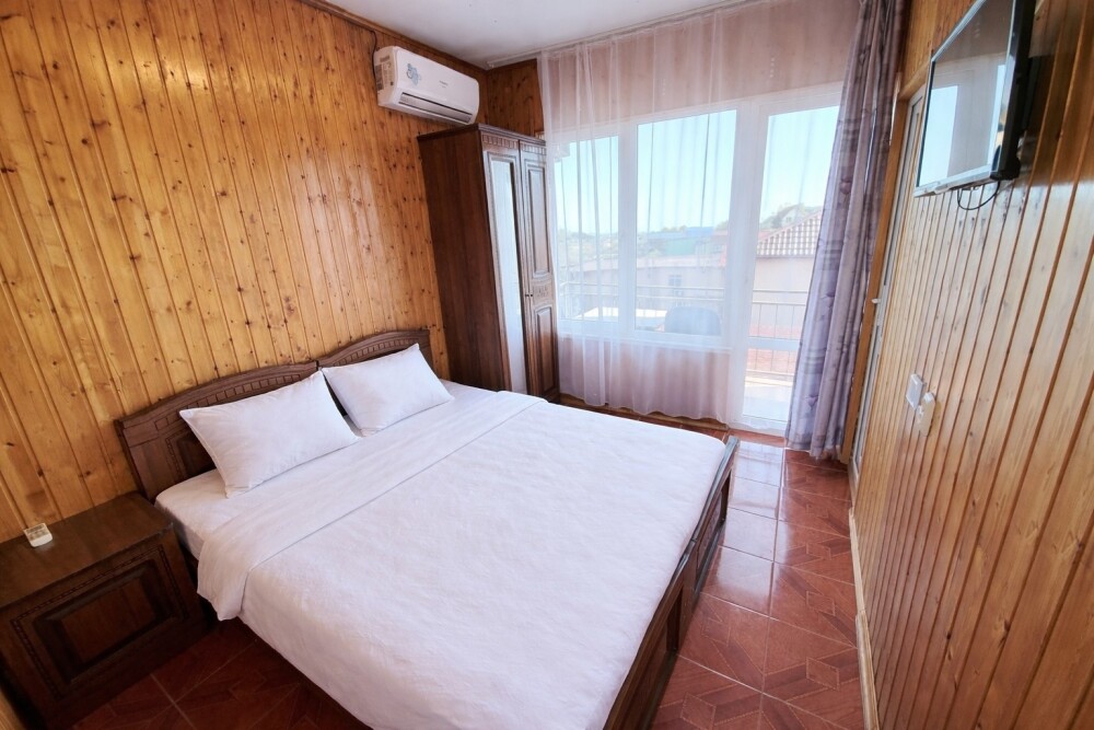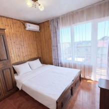 Просторные номера с хорошим ремонтом в новом корпусе (расположен в 150 метрах от основного). В номерах есть: душ и туалет, ЖК телевизор (диагональ 81 см.), кондиционер (сплит-система), холодильник, чайник, фен, шкаф для вещей, стиральные принадлежности, отопление. Индивидуальный вход в каждый номер, собственный (не проходной) балкон с местом для отдыха (стол, кресла) с панорамным видом на море.