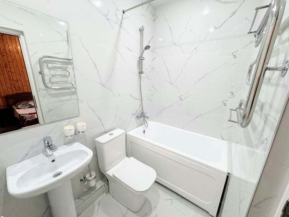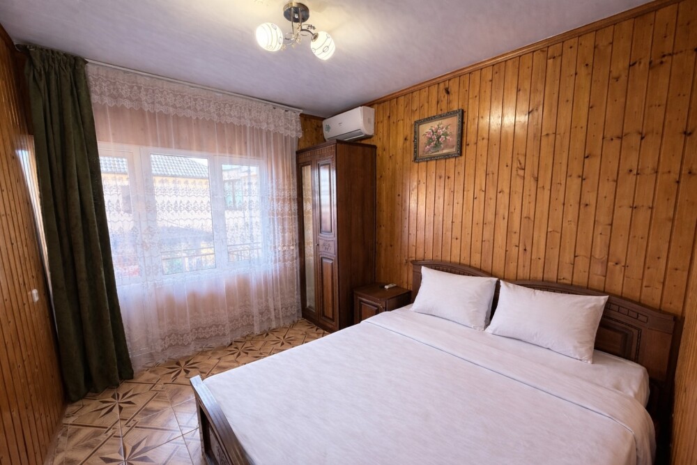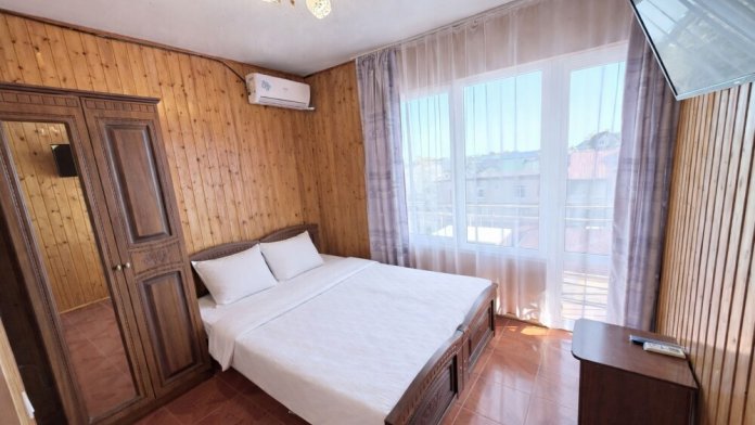 Просторные номера с хорошим ремонтом. В номерах есть: душ и туалет, ЖК телевизор (диагональ 81 см.), кондиционер (сплит-система), холодильник, чайник, фен, шкаф для вещей, стиральные принадлежности, отопление. Индивидуальный вход в каждый номер, собственный (не проходной) балкон с местом для отдыха (стол, кресла) с панорамным видом на горы и бассейн.