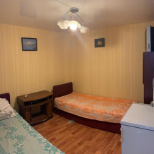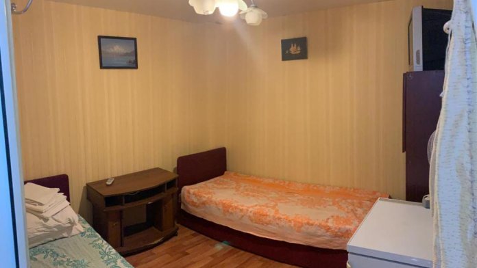 На кухне под навесом - электроплита,. Холодильник, телевизор,утюг,фен,посуда,вентилятор. Две односпальные кровати можно сложить в одну двухспальную.