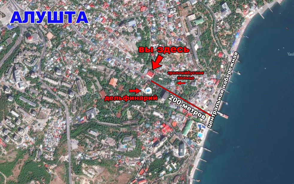 В 200 метрах - центральная набережная алушты с пляжами, аттракционами, кафе и ресторанами, развлекательными центрами. На первом этаже комплекса - ресепшен отеля, супермаркет «Пуд», банкомат «Сбербанка», пункт выдачи заказов Wildberries. Напротив - ночной клуб, караоке, дельфинарий, природный парк крым в миниатюре. В 50-ти метрах - троллейбусная станция с прямым сообщением до Симферополя, Ялты, Гурзуфа и других курортов ЮБК. Из окон - красивые виды на море, горы и исторический центр Алушты крепость Алустон.