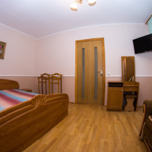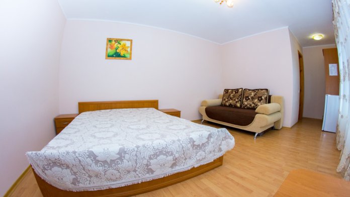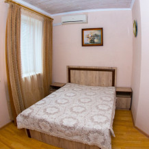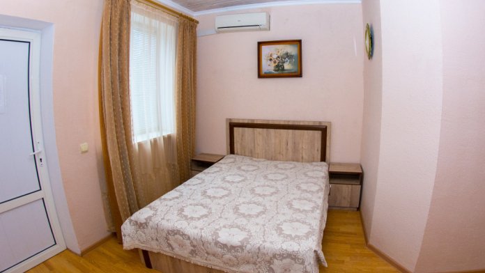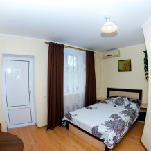 Площадь номера (24 м2). В номере: двуспальная кровать,полуторный диван,тумбочки, шкаф для одежды, стол, стулья, кресло-кровать, трельяж, подвесной шкаф для посуды;санузел (туалет, умывальник, душ-кабина, бойлер); телевизор (спутниковое), холодильник, кондиционер. Холодная и горячая вода круглосуточно.К номеру прилагается зеленая беседка.Основных мест 4 + 1 доп. место.