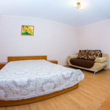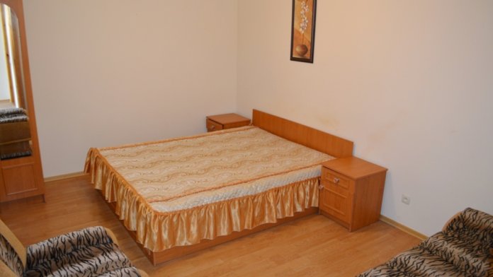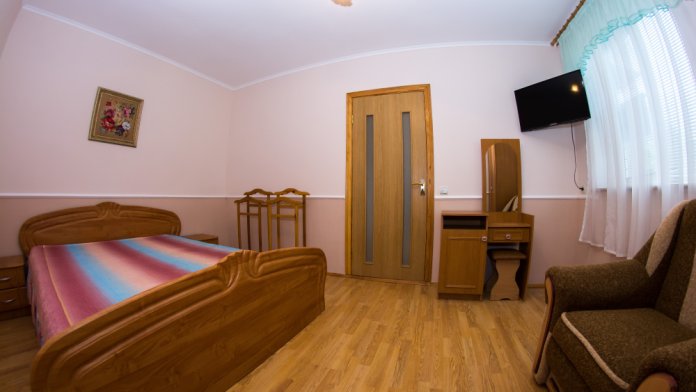 Площадь номера (16 м2). В номере: двуспальный диван,кресло,тумбочки, шкаф для одежды,журнальный столик,пуфики,стулья,подставка для обуви, телевизор (кабельное),холодтльник,кондиционер; санузел (туалет, умывальник, душ-кабина, бойлер). Холодная и горячая вода круглосуточно.К номеру прилагается зеленая беседка. Основных мест 2 + 1 доп. место.