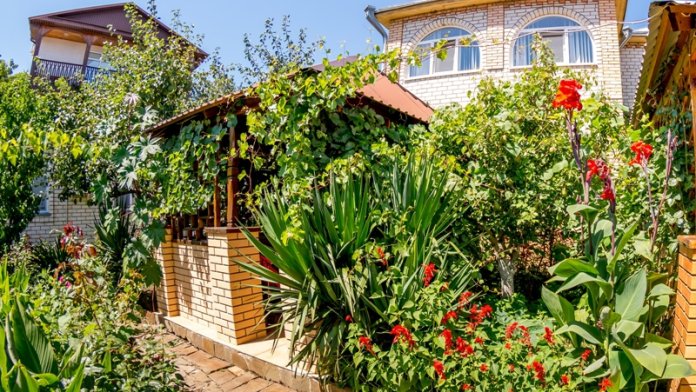 На зеленой цветущей территории гостевого дома (площадь 20 соток), находятся красивые деревянные беседки, скамейки, качели, детская площадка, удобные мангалы,ночные огоньки, благоустроенная бесплатная автостоянка и смотровая площадка с видом на море и горы.