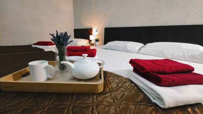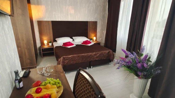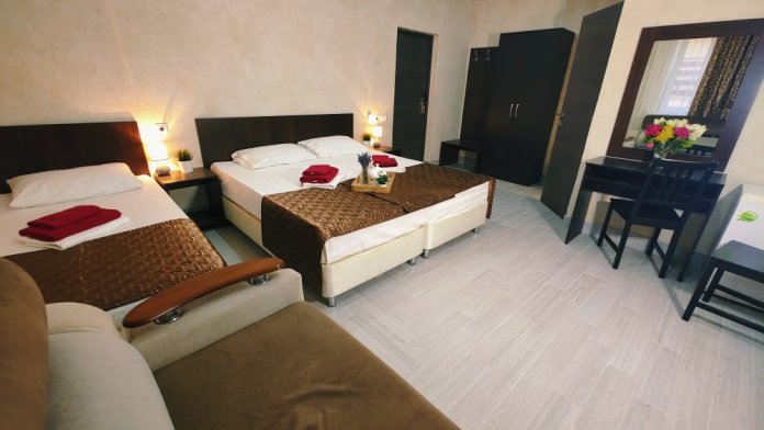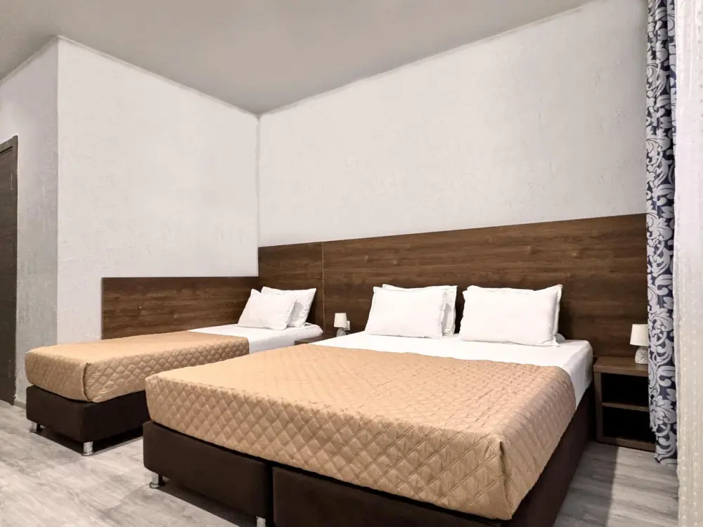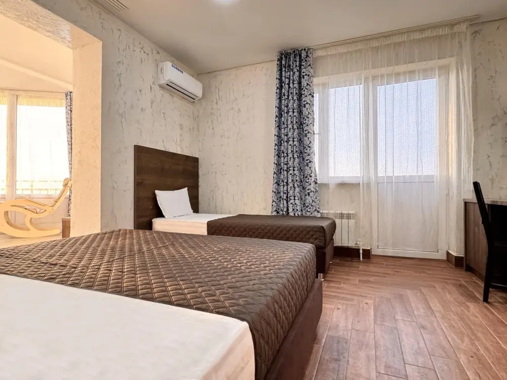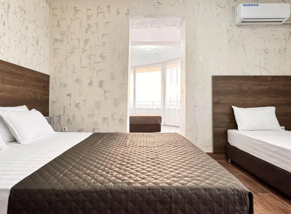 Комфортабельный и уютный двухкомнатный Люкс оснащен: двумя двуспальными кроватями и двуспальным диваном, кондиционером, шкафом для одежды и всей необходимой мебелью. Также в номере есть мини-холодильник, телевизор и Wi-Fi. Имеется просторный балкон для отдыха на свежем воздухе. Проведите незабываемое время в нашем отеле и наслаждайтесь комфортом.