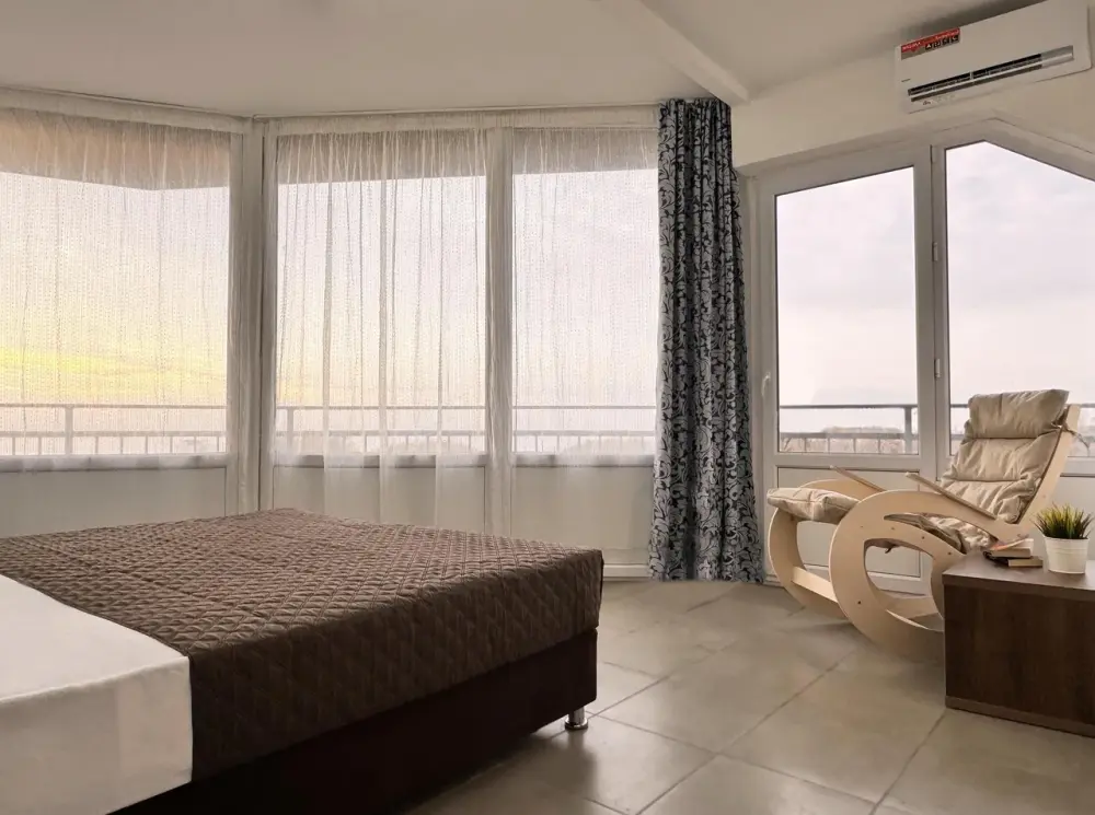 Это потрясающий двухкомнатный номер с балконом и панорамным видом на море с раздельным входом. В номере имеется две двуспальные кровати, одна односпальная кровать. Для вашего удобства в каждой комнате установлен телевизор, кондиционер, доступен Wi-Fi, имеются шкаф для хранения вещей и прикроватные тумбочки, мини-холодильник, а также ванная комната в каждой комнате. Балкон оборудован мебелью для отдыха, а также подвесным креслом. Этот номер отлично подойдет для утреннего кофе, отдыха на свежем воздухе или наслаждения живописными видами на море.