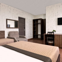 Уютный трехместный номер предлагает комфортное размещение для трех человек или семейной пары с ребенком. Номер оснащен: двуспальной и односпальной кроватью или двуспальной кроватью и креслом-кроватью, прикроватными тумбочками, телевизором, мини-холодильником и кондиционером, wi-fi, столом, стульями. Санузел с душем обеспечивает комфорт для гостей. Небольшое окно. Номер без балкона.