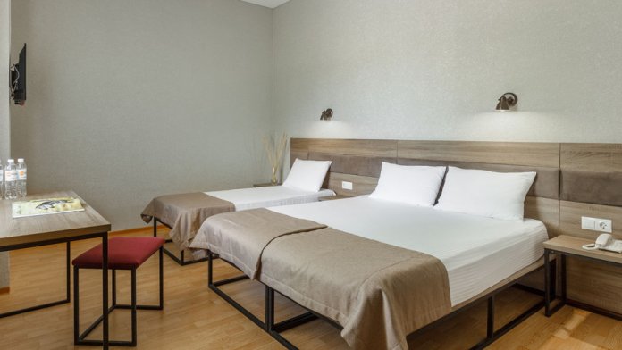 В номере: три раздельные кровати, ТВ, холодильник, эл.чайник, кондиционер (сплит-система), телефон, сейф, балкон с летней мебелью и сушилкой для белья.