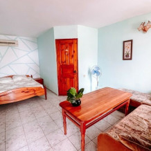 Во всех номерах турбазы обязательно есть санузел (один или два), холодильник и телевизор. Отдых в Анапе мы предложим и парам, и большим компаниям - есть номера вместительностью от двух до шести человек. Есть возможность установить дополнительные спальные места.