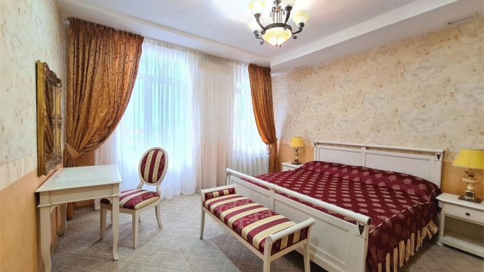 Изысканный трехкомнатный номер с двуспальной кроватью, двухместным раскладным диваном, кухонной зоной и балконом.