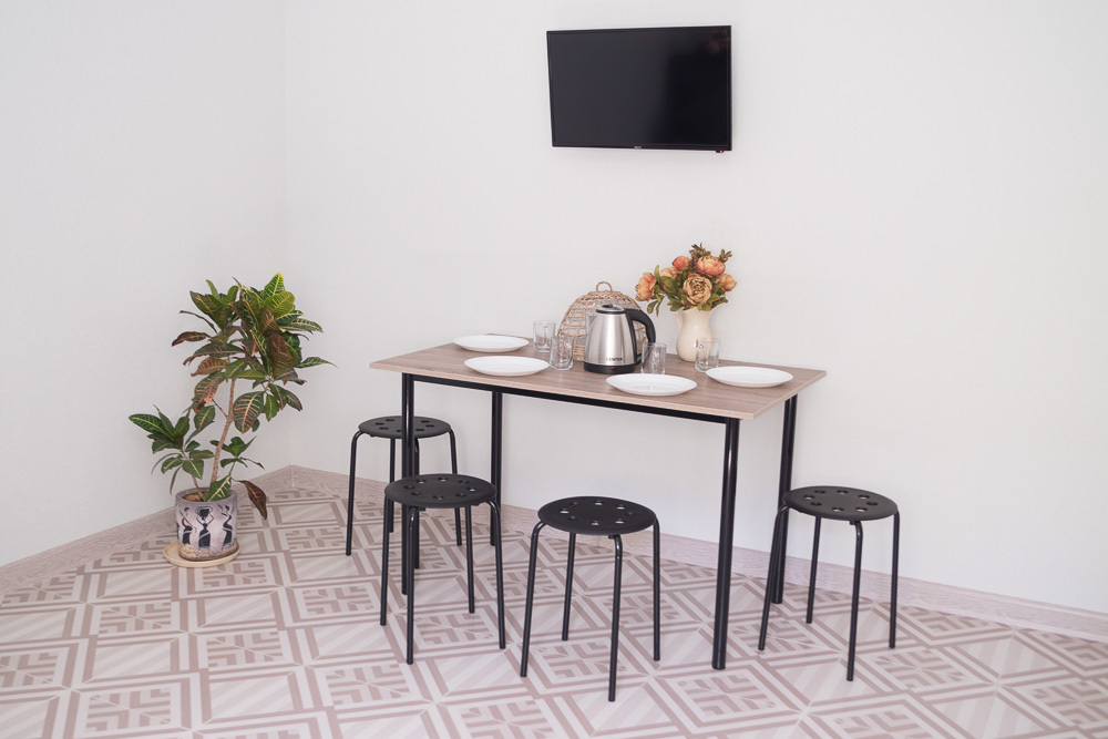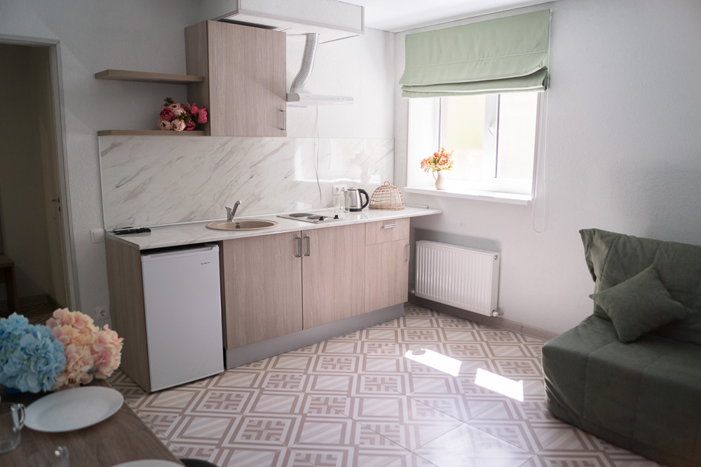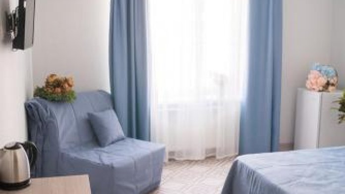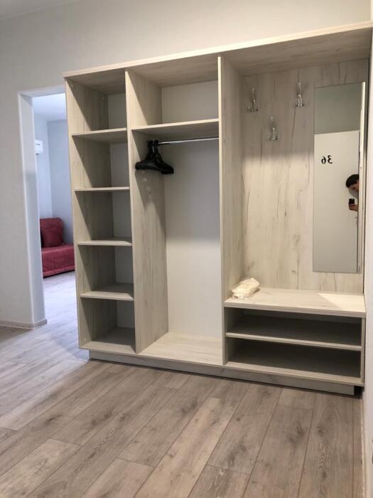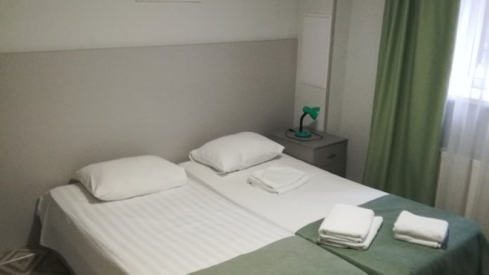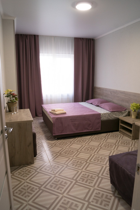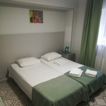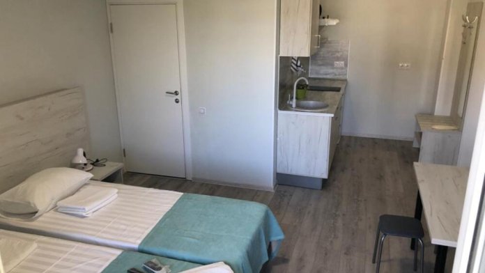 1 номер СТУДИО. (Находится на нулевом этаже). Номера 22 м. кв. (Прихожая с вешалкой и подчемоданником, комната с кухней, холодильник, чайник, столик со стульями и пуфом, шкаф, прикроватные тумбочки. Дополнительная раскладная кровать по требованию. Сплит система(кондиционер). В номере 2 односпальные кровати(90х200). Совмещенный с/у с душевой.