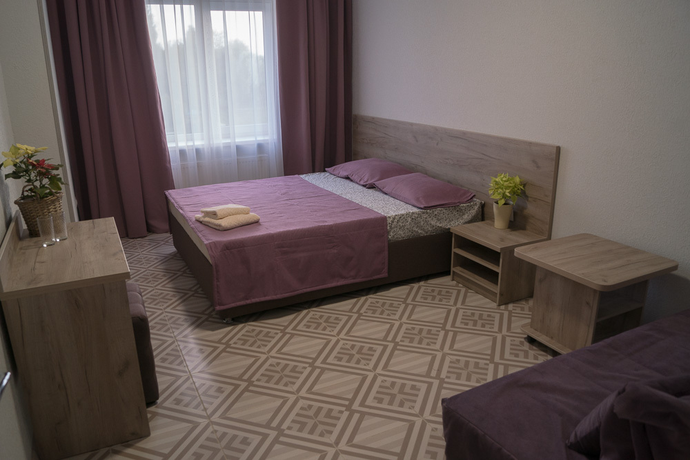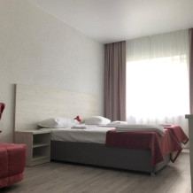 3 номера СТАНДАРТЫЕ. (Находятся на 1-3 этажах) Номера 22м. кв. (Прихожая, с вешалкой и подчемоданником, большая двуспальная кровать, кресло трансформер(90х200), шкаф, туалетный столик с пуфом и зеркалом, прикроватные тумбочки. Холодильник, чайник, посуда (тарелки, стаканы, кружки, ложки, вилки, ножи, разделочная доска. Сплит система(кондиционер), Совмещенный с/у с душевой. Номера без балконов.