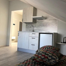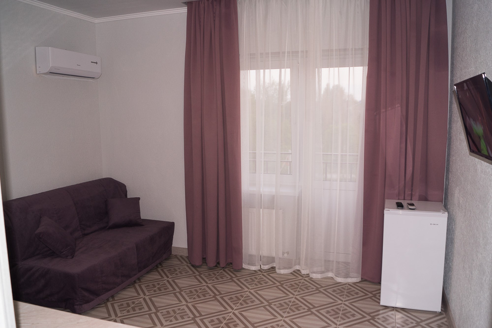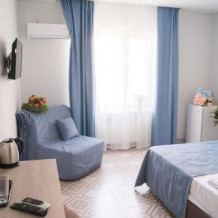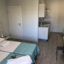 4 номера СТУДИО. (Находятся на 1-3 этажах). Номера 22 м. кв. (Прихожая с вешалкой и подчемоданником, комната с кухней, холодильник, чайник, столик со стульями и пуфом, шкаф, прикроватные тумбочки. Дополнительная раскладная кровать по требованию. Сплит система(кондиционер). В номерах большие двуспальные кровати(180х200). Совмещенный с/у с душевой. 3 номера СТУДИО с балконами.