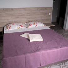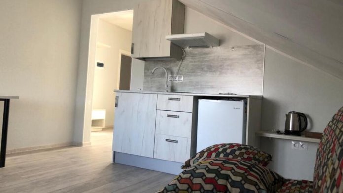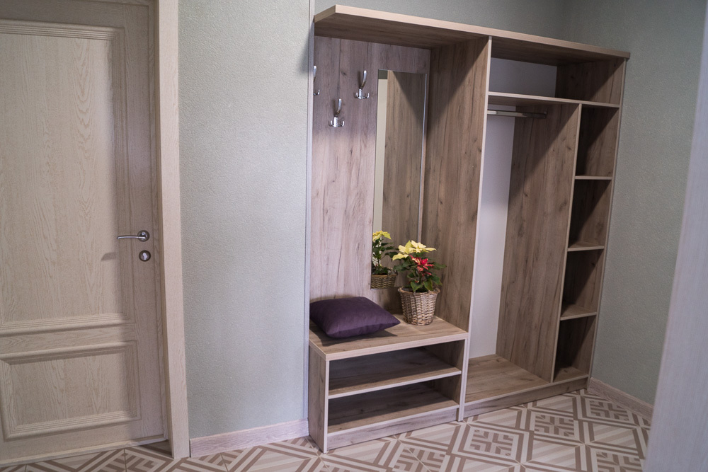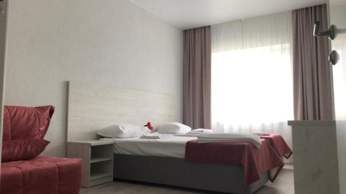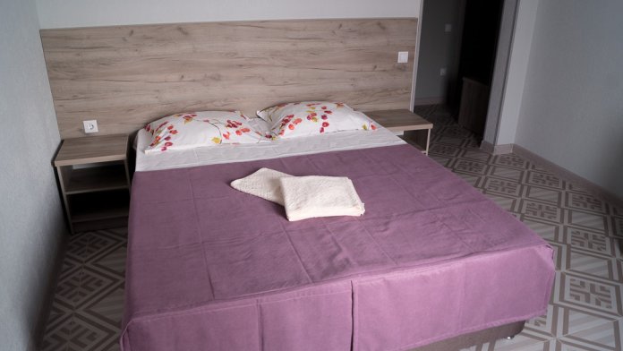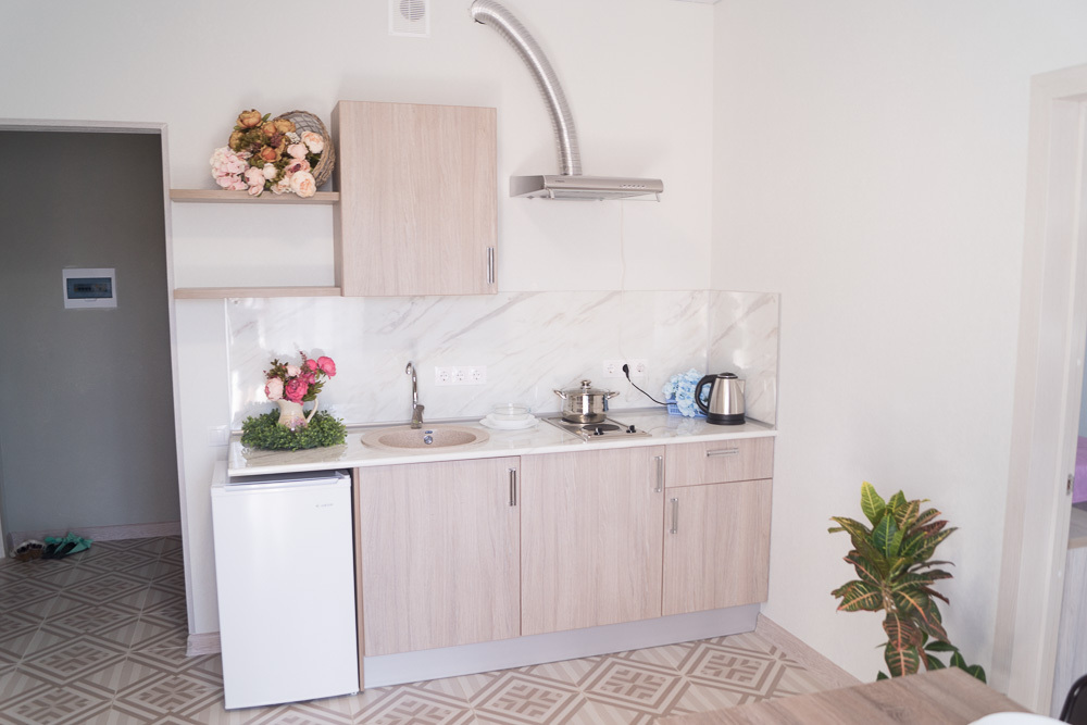 16 номеров АПАРТАМЕНТЫ С КУХНЕЙ. (Находятся на 1-3 этажах). Номера от 35 до 50 м. кв. (Прихожая, кухня гостиная с полностью меблированной кухней для полного приготовления обедов, чашки, ложки, поварешки, кастрюли, сковорода, чайник, холодильник, диван трансформер(200х200). И отдельная комната с большой двуспальной кроватью(200х200), или двумя раздельными кроватями(90х200), в некоторых номерах-кресло трансформер(90х200), туалетный столик с зеркалом и пуфом, шкаф для одежды, прикроватные тумбочки. Сплит система(кондиционер)Совмещенный с/у с душевой. 14 апартаментов с кухней имеют один или два балкона. Номера рассчитаны на 4-5 взрослых гостей.