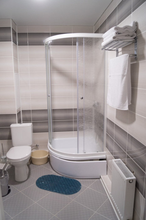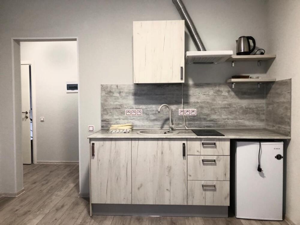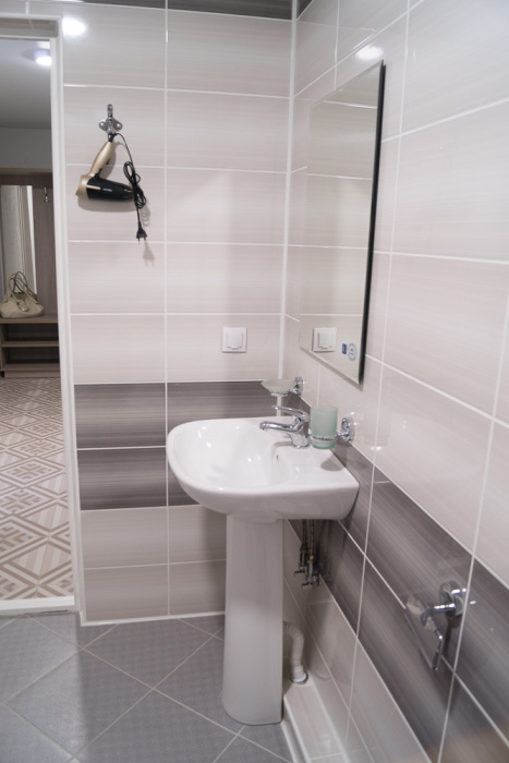 СТУДИО. (Находится на нулевом этаже). Номера 22 м. кв. (Прихожая с вешалкой и подчемоданником, комната с кухней, холодильник, чайник, столик со стульями и пуфом, шкаф, прикроватные тумбочки. Дополнительная раскладная кровать по требованию. Сплит система(кондиционер). В номере 2 односпальные кровати(90х200). Совмещенный с/у с душевой.