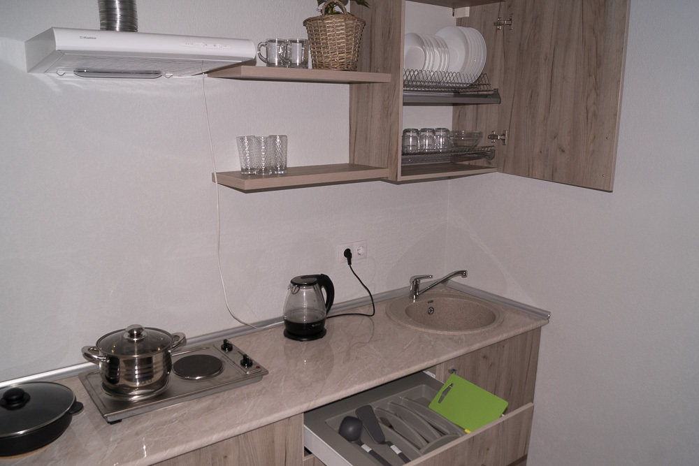 АПАРТАМЕНТЫ С КУХНЕЙ. (Находятся на 1-3 этажах). Номера от 35 до 50 м. кв. (Прихожая, кухня гостиная с полностью меблированной кухней для полного приготовления обедов, чашки, ложки, поварешки, кастрюли, сковорода, чайник, холодильник, диван трансформер(200х200). И отдельная комната с большой двуспальной кроватью(200х200), или двумя раздельными кроватями(90х200), в некоторых номерах-кресло трансформер(90х200), туалетный столик с зеркалом и пуфом, шкаф для одежды, прикроватные тумбочки. Сплит система(кондиционер)Совмещенный с/у с душевой. 14 апартаментов с кухней имеют один или два балкона.