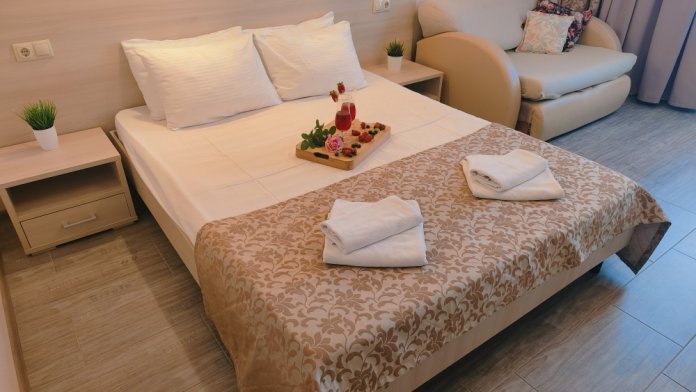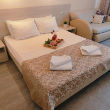 Двухкомнатные апартаменты с персональной кухней и балконом: просторное светлое помещение, состоящее из двух изолированных комнат, прихожей и совмещенного санузла. Обстановка комнат апартаментов включает в себя все необходимые удобства: в спальне двуспальная кровать, прикроватные тумбочки, раскладной диван, туалетный столик, стол, пуф, шкаф, телевизор, кондиционер. В кухне-гостиной: раскладной диван, кухонный гарнитур, столовая группа (стол, стулья), шкаф, холодильник, из комнаты – выход на балкон. В прихожей есть входная группа (вешалка, зеркало, тумбочка).