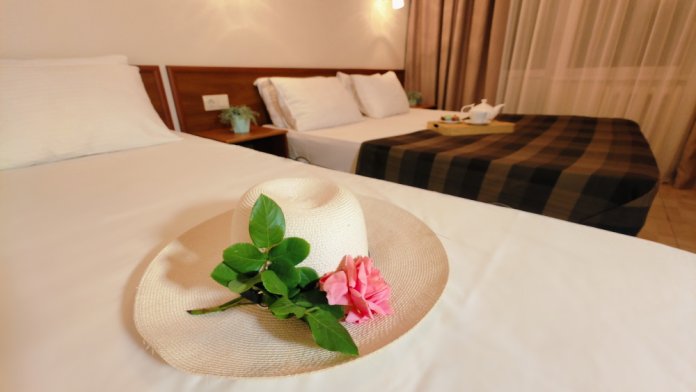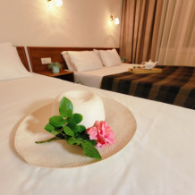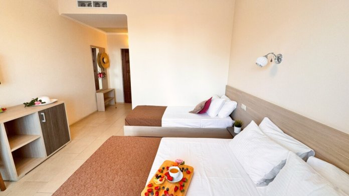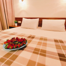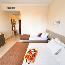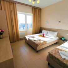 Трехместный однокомнатный номер с балконом. Номер оснащен: двуспальная кровать и односпальная кровать или три односпальные кровати, прикроватные тумбочки, прикроватные светильники, стол, шкаф, вешалка, тумба под обувь, кондиционер, мини-холодильник, TV, телефон. Балкон оснащен мебелью для отдыха (стол, стулья). Ванная комната: ванная, туалет, раковина.