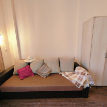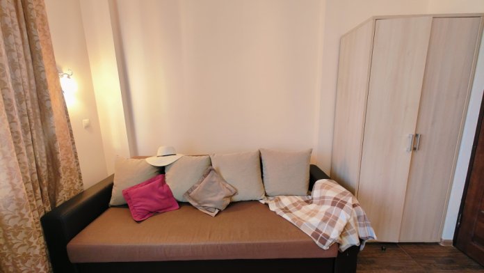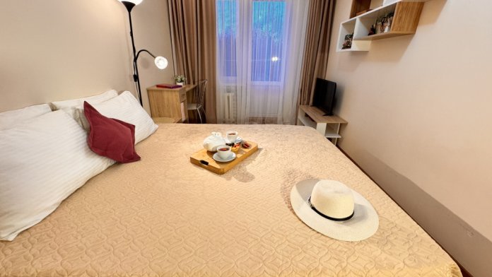 Двухкомнатный номер с кухней и балконом. В спальне: двуспальная кровать, стол, стул, прикроватные тумбочки, телевизор, книжные полки, балкон. Кухня-гостиная: раскладной диван, стол, стулья, кухонный гарнитур, посуда. В прихожей шкаф для одежды и хранения вещей, вешалка, зеркало, полки для обуви. В номере имеется небольшой совмещенный санузел.