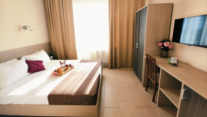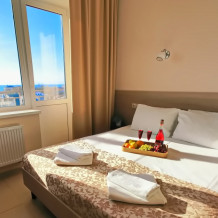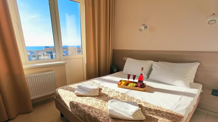 Уютный 2х местный номер с балконом и прямым видом на бескрайнее море. Интерьер выполнен в светлых тонах, дополнен элементами из дерева и текстиля. Большое окно открывает захватывающий вид на море, позволяя гостям наслаждаться прекрасным морским пейзажем в любое время суток. Номер оснащен: двуспальная кровать, прикроватные тумбочки, стол, стулья, шкаф, прихожая, зеркало, телевизор, холодильник, кондиционер. Ванная комната оборудована современной душевой кабиной, туалетом и раковиной. Балкон оборудован мебелью для отдыха на свежем воздухе, где гости могут насладиться прекрасным видом.