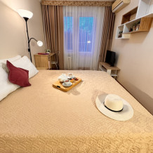 Стандартный двухместный номер с французским балконом. Номер оборудован в соответствии с необходимым комфортом для проживания гостей. В номере имеется двуспальная кровать или две односпальные кровати, прикроватные тумбочки, стол, стулья, шкаф для хранения вещей и одежды, телевизор, холодильник, кондиционер.