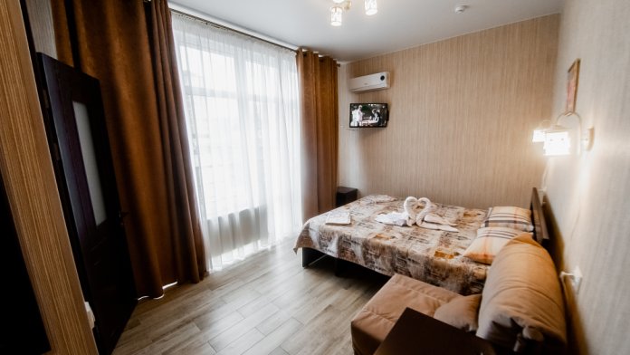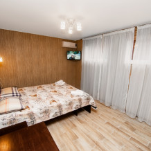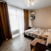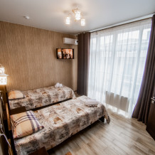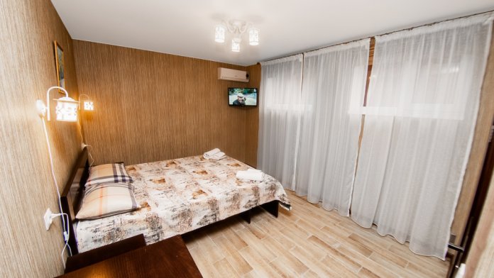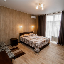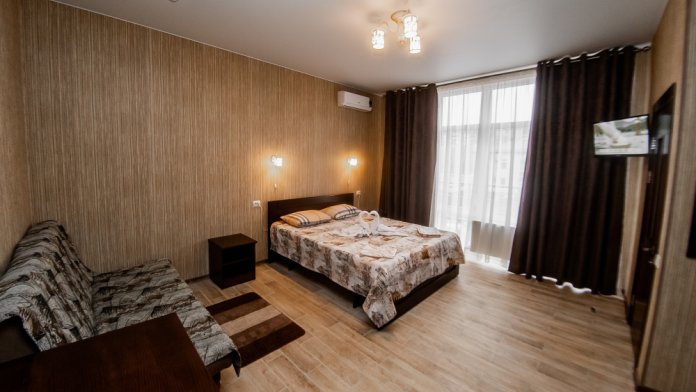 Просторный однокомнатный номер с балконом. Рассчитан на 4 человека с возможностью установки дополнительного места. В номере: 1 двуспальная кровать, двуспальный диван, шкаф, стол, 2 тумбочки, телевизор, сплит-система. Санузел совмещён (туалет, душевая кабина), имеются фен, банные принадлежности.
