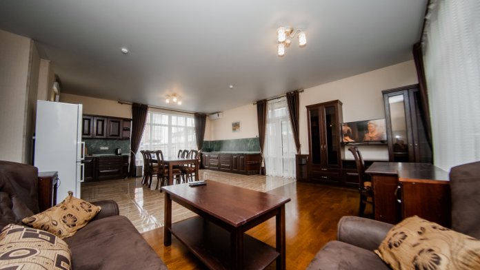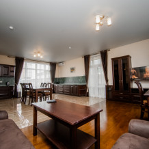 Трёхкомнатные апартаменты на 1 этаже. Рассчитаны на 6 человек с возможностью установки дополнительного места. В апартаментах: 1 двуспальная и 2 односпальные кровати, двуспальный диван, шкаф-купе, 5 столов, 6 тумбочек, 2 телевизора, 3 сплит-системы, сейф, кухня. Санузел совмещён (туалет, ванна, душ), имеются стиральная машина, фен, банные принадлежности. Кухня: газовая плита, духовка, вытяжка, столовые приборы, набор посуды, электрический чайник, микроволновая печь, холодильник.