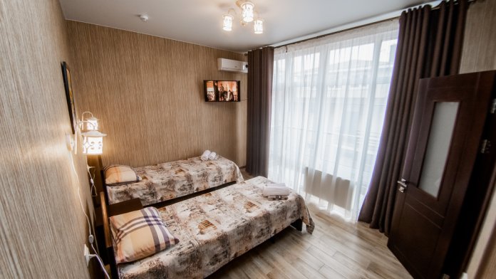 Просторный двухкомнатный номер с балконом. Рассчитан на 4 человека с возможностью установки дополнительного места. В номере: 1 двуспальная и 2 односпальные кровати, шкаф, 2 стола, 4 тумбочки, холодильник, 2 телевизора, 2 сплит-системы. Санузел совмещён (туалет, душевая кабина), имеются фен, банные принадлежности.