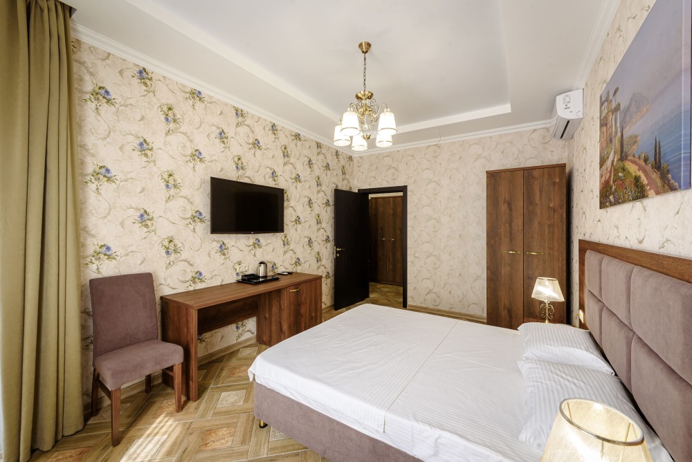 Двухкомнатный номер 35м² на 1, 2 или 3 этаже с балконом, видом на сосновый лес (некоторые номера с частичным видом на озеро Абрау), вместимостью до 4 гостей.Двухспальная кровать, шкаф, рабочий стол, кресло, холодильник, чайник, чайная пара, кондиционер, москитные сетки, спутниковое TV, wi-fi. Две односпальные кровати во второй комнате. Санузел, душ, фен, тапочки, шампунь, гель для душа, мыло и крем для рук и тела, зубные наборы. Подогреваемый бассейн, бесплатная парковка, детская площадка, кафе.