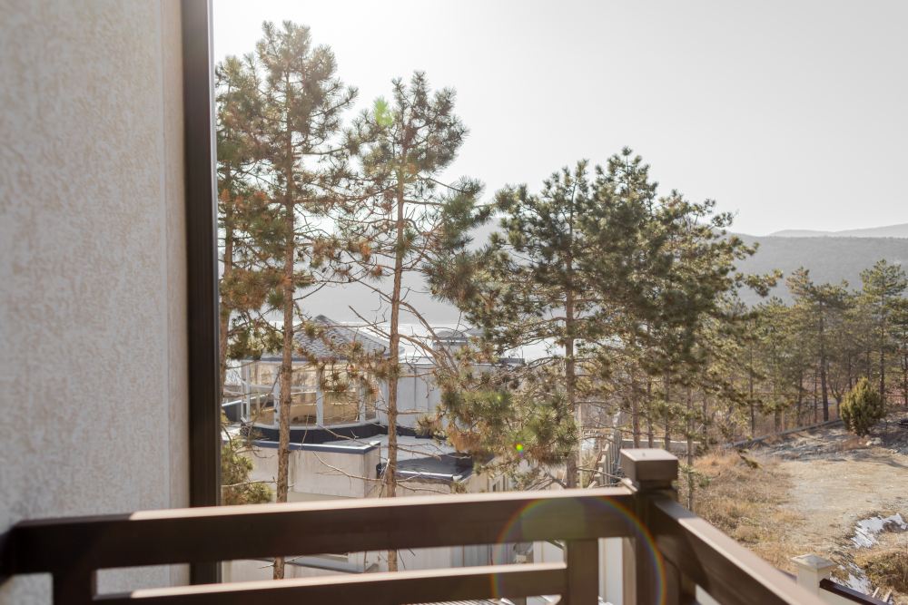 Двухкомнатный номер 42 м² на 2 или 3 этаже с большим балконом, видом на озеро Абрау и заповедный сосновый лес, до 4 гостей.