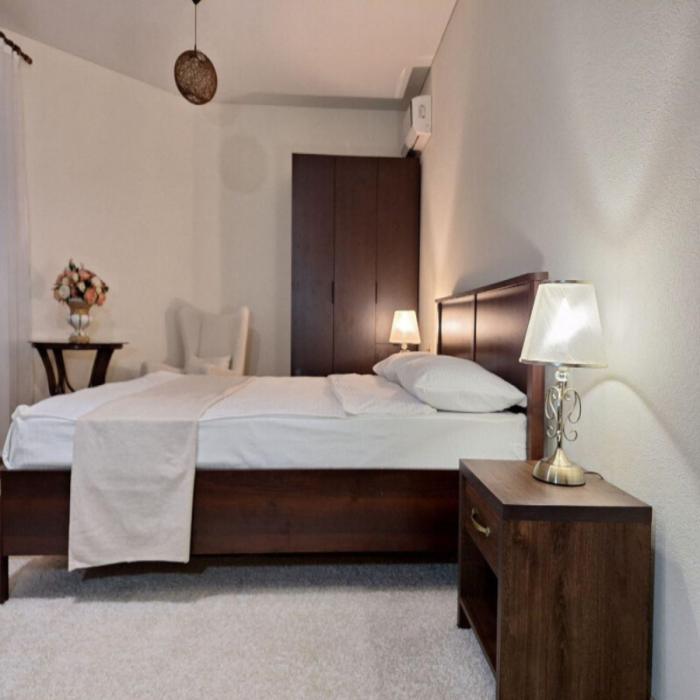 Двуспальная кровать, кондиционер, шкаф, двухместный диван, холодильник, чайная станция, в каждой комнате: спутниковое TV, москитные сетки, wi-fi.Санузел, душ, фен, тапочки, халаты, шампунь, гель для душа, мыло и крем для рук и тела, зубные наборы. Подогреваемый бассейн, бесплатная парковка, детская площадка, кафе.