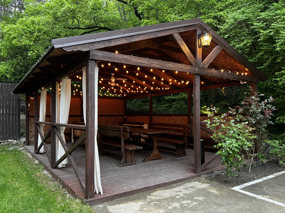 Деревянная беседка - идеальное место для работы на свежем воздухе или небольшого праздника;