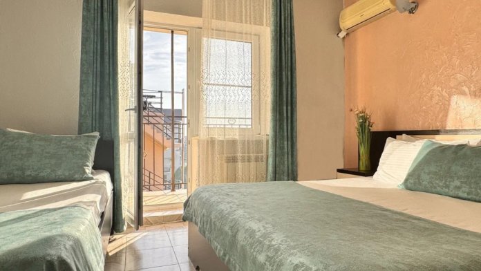 Номер оснащен: 3-мя односпальными кроватями или односпальной кроватью и двуспальной кроватью, прикроватными тумбочками, бра, телевизором, кондиционером, шкафом, вешалкой, зеркалом, чайником, мини-холодильником, феном. Балкон оборудован летней мебелью для отдыха на свежем воздухе, столом и стульями.